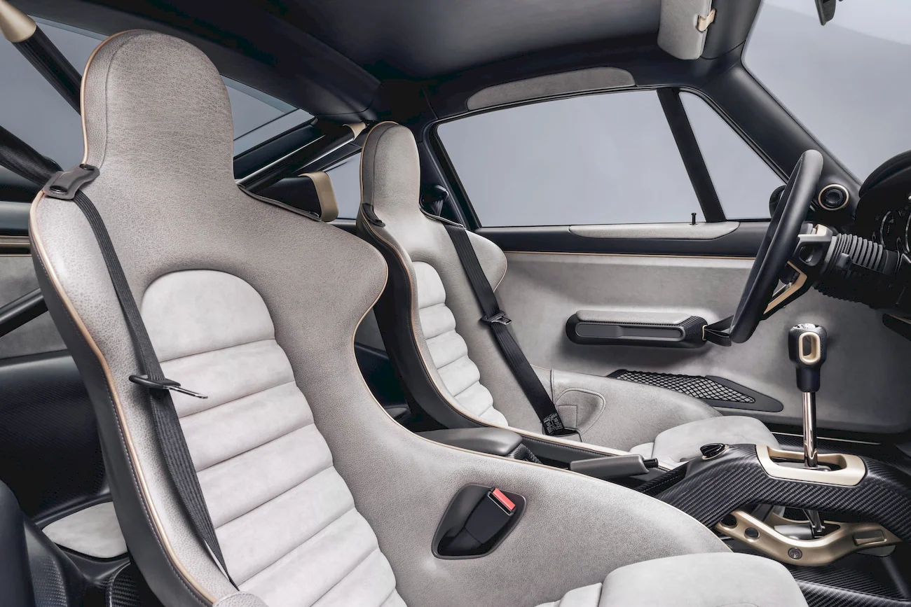 The Singer DLS Turbo Sorcerer features a strict two-seat layout. Behind the lightweight bucket seats for the driver and passenger sit a cross-braced tubular reinforcement bar and a rear luggage shelf.