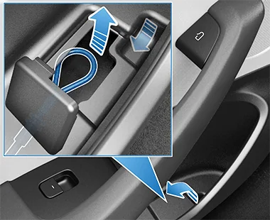 At the bottom of the rear door pocket, just in front of the manual release cover, there is a small slot. Insert your finger into the slot and lift the cover to remove it. Then pull the mechanical release cable forward to open the door.