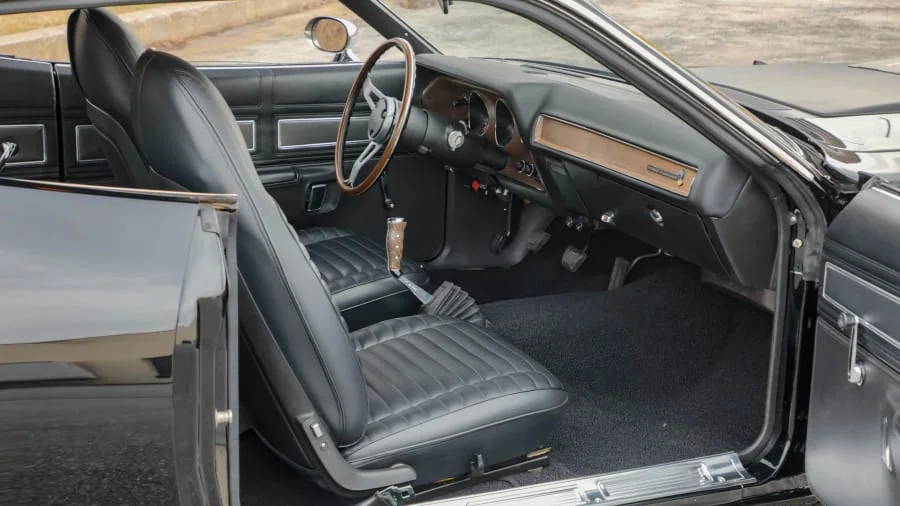 Finished in factory TX9 Formal Black over a matching black interior, this triple-black coupe features the vacuum-operated Air Grabber hood and a Hurst Pistol Grip shifter. The paperwork includes two original broadcast sheets and an inspection report from Dave Wise of MMC Detroit, confirming the car retains its original body panels and VIN tags.