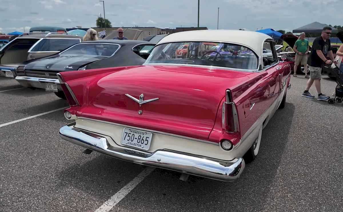 A flawlessly restored 1956 Plymouth Belvedere steals the spotlight at a Minnesota car show with timeless style and presence.