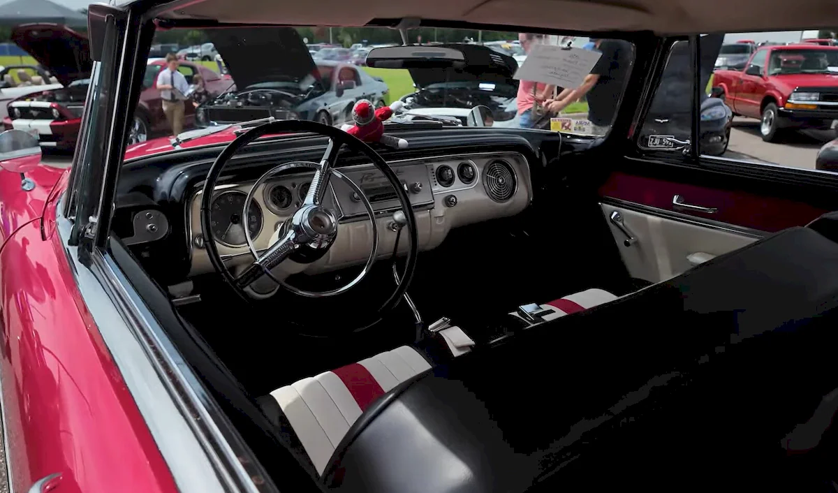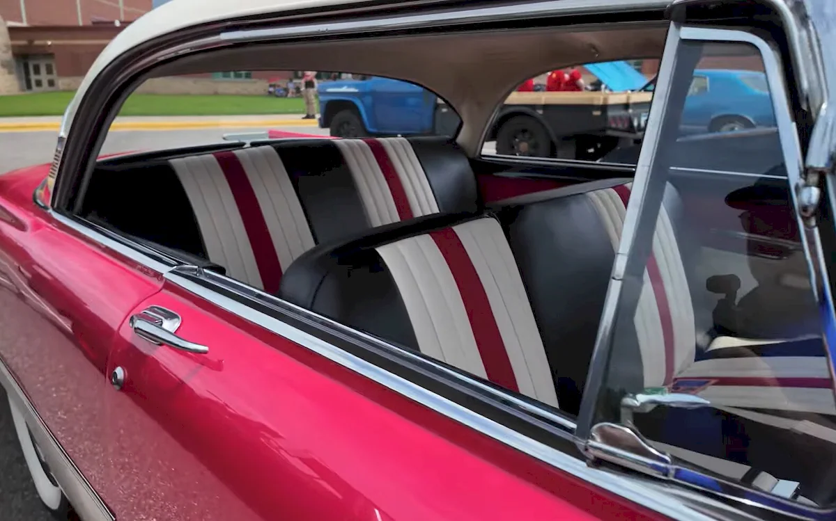 The exterior finish is exceptional, highlighted by a striking two-tone combination. Though it can appear slightly pink in bright sunlight, the body is most likely painted in factory-correct Cherry Red, paired with Eggshell White on the roof and lower inserts. The arrow-shaped white accent along the side gives the car an unmistakable mid-century flair.