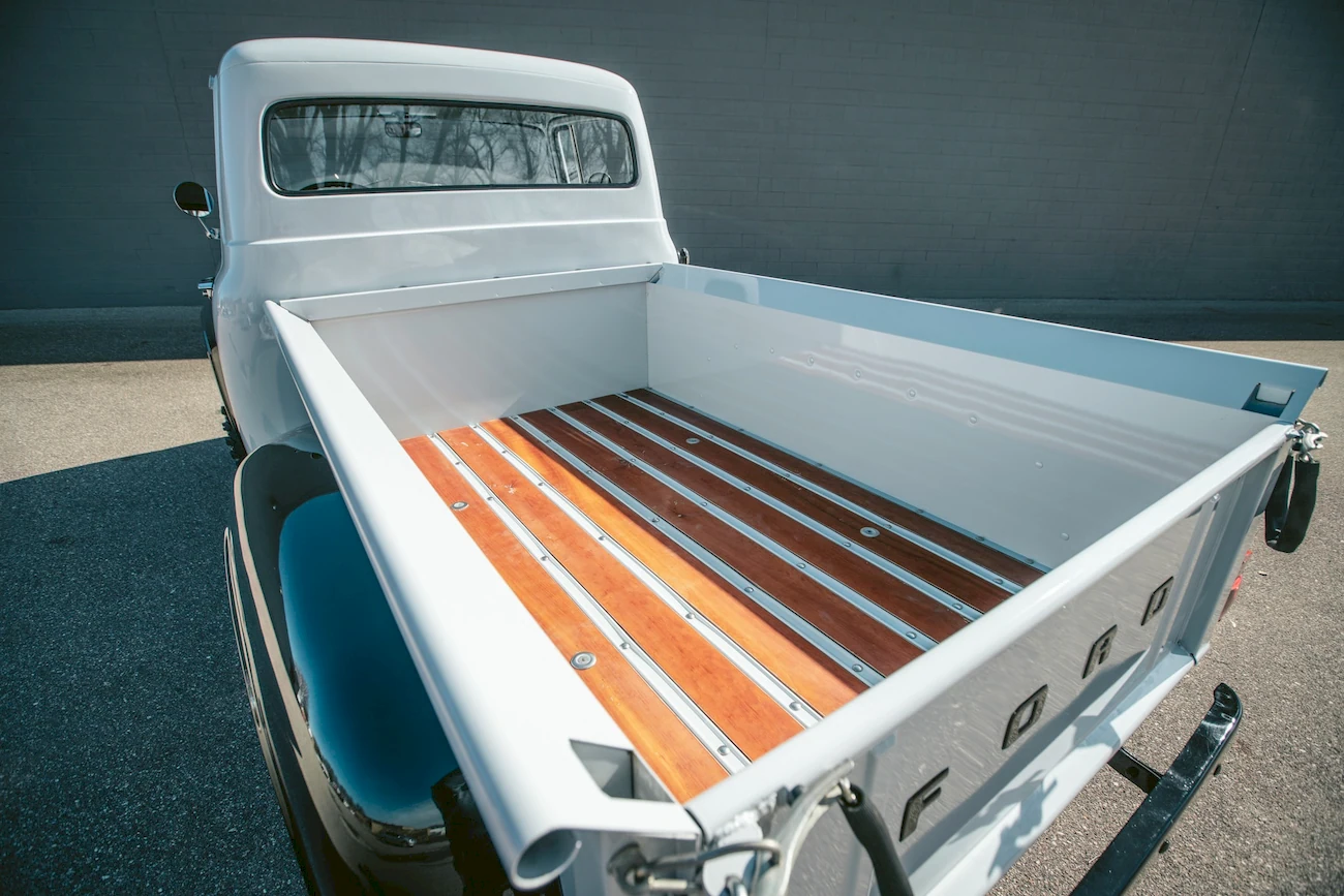 The exterior flaunts a sleek dual-tone gray and black paint, while the cabin showcases black interior with tasteful red accents. It’s a single cab, short-bed, step-side model with a “stance, brightwork, and attention to detail (that) reflect a no-compromise restoration executed at a very high standard.”