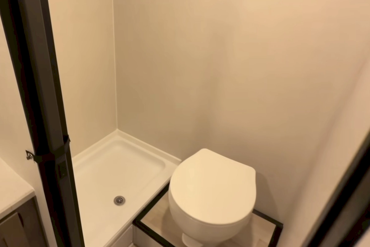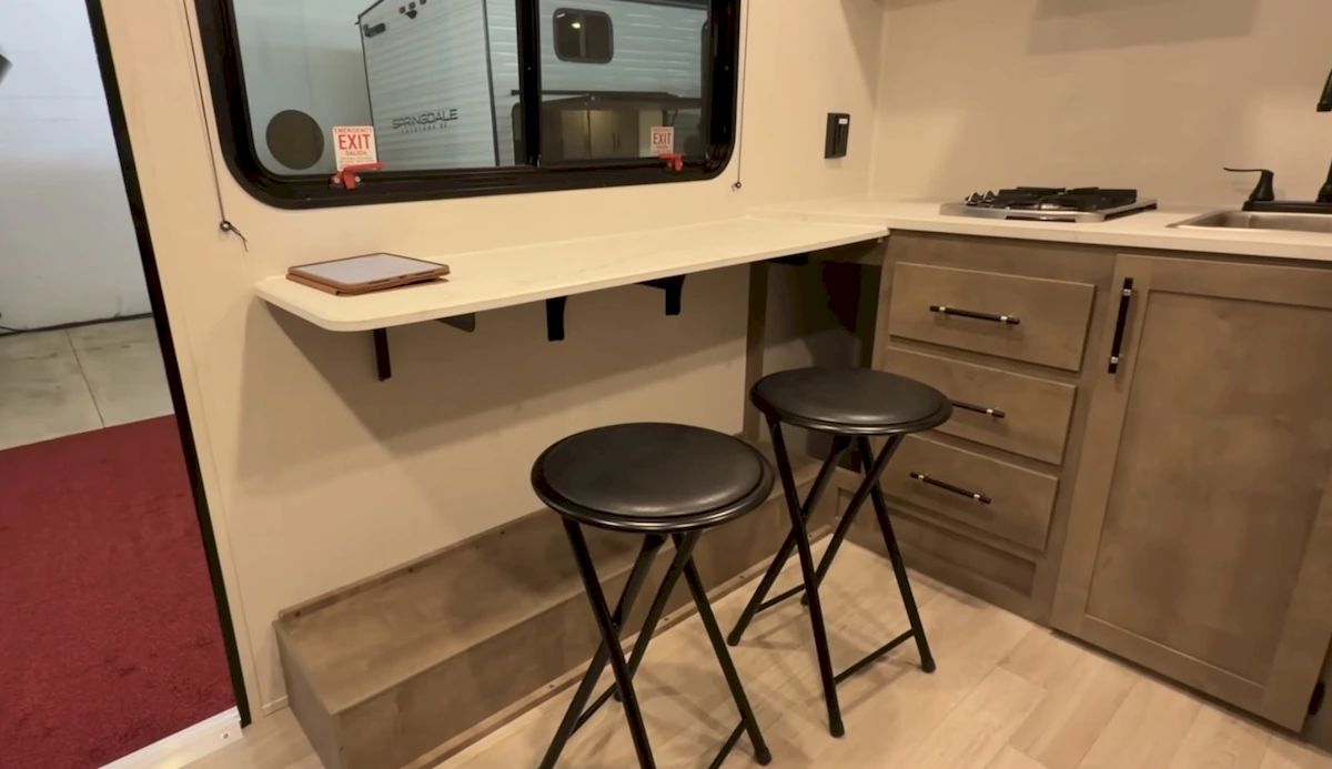 By placing both the kitchen and a dry bathroom at the rear, Keystone frees up the rest of the space for daily living. Up front, there’s a double bed with a fold-down bunk above it. Along one wall, you get a storage and utility tower, while the opposite side features a bar-style dining setup under a large window—honestly, not a bad place to sit down for dinner.