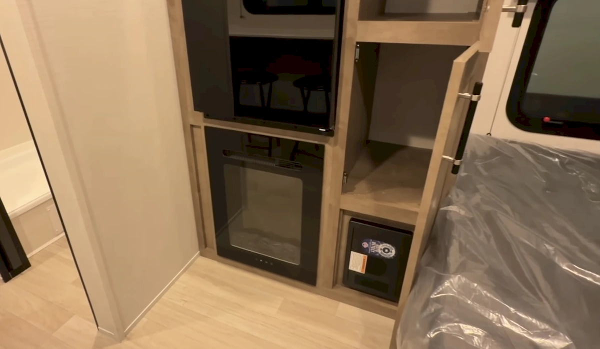 The rest of the kitchen setup—namely the fridge and oven—is positioned along the side wall, with an electric fireplace/space heater below. Cabinets around this section can handle food, gear, or even clothes if you run out of closet space near the entry.