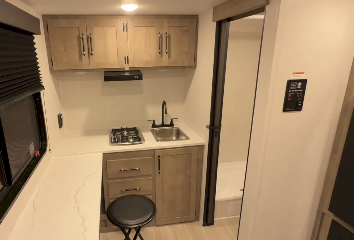 Digging into the details, the rear kitchen stands out more than expected for a camper this size. It comes equipped with a two-burner gas cooktop, a sink with a tall faucet, a range hood, and a surprising amount of counter space. Storage is well thought out too, both above and below. Myles described it as a “layout that doesn’t suck,” and it’s hard to argue with that, especially given how usable the space feels.