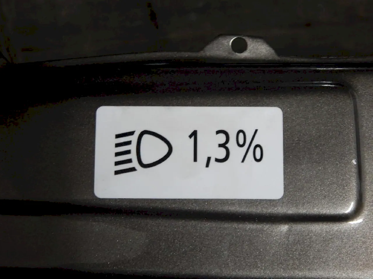 The number on the sticker helps technicians set the beam correctly. Essentially, it shows how much the top edge of the light beam drops as the distance from the car increases. For example, if the sticker shows 1.3%, then at a distance of about 33 feet from the vehicle, the top edge of the beam should sit roughly 5 inches below the center of the headlight. When headlights are adjusted properly, that’s roughly where the beam should fall.