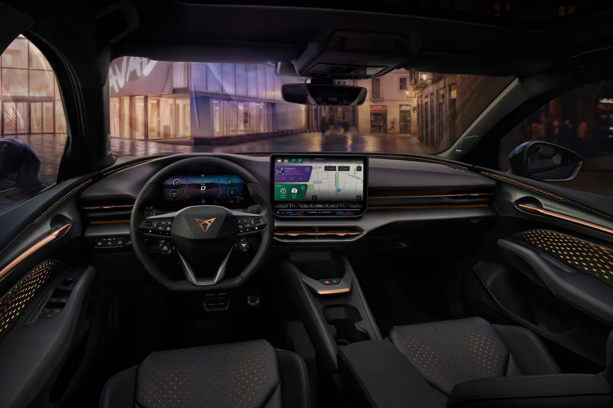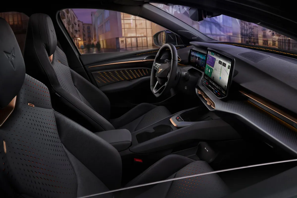 Base models feature upholstery made from recycled Dinamica fabric. Higher trims add vegan leather and a unique knitted 3D textile material. Available features include Smart Light ambient lighting that reacts to driving conditions, dual-zone Climatronic climate control, multiple USB-C ports, and a 12-speaker Sennheiser sound system that simulates the sound of a Formula E race car in Performance and Cupra driving modes.