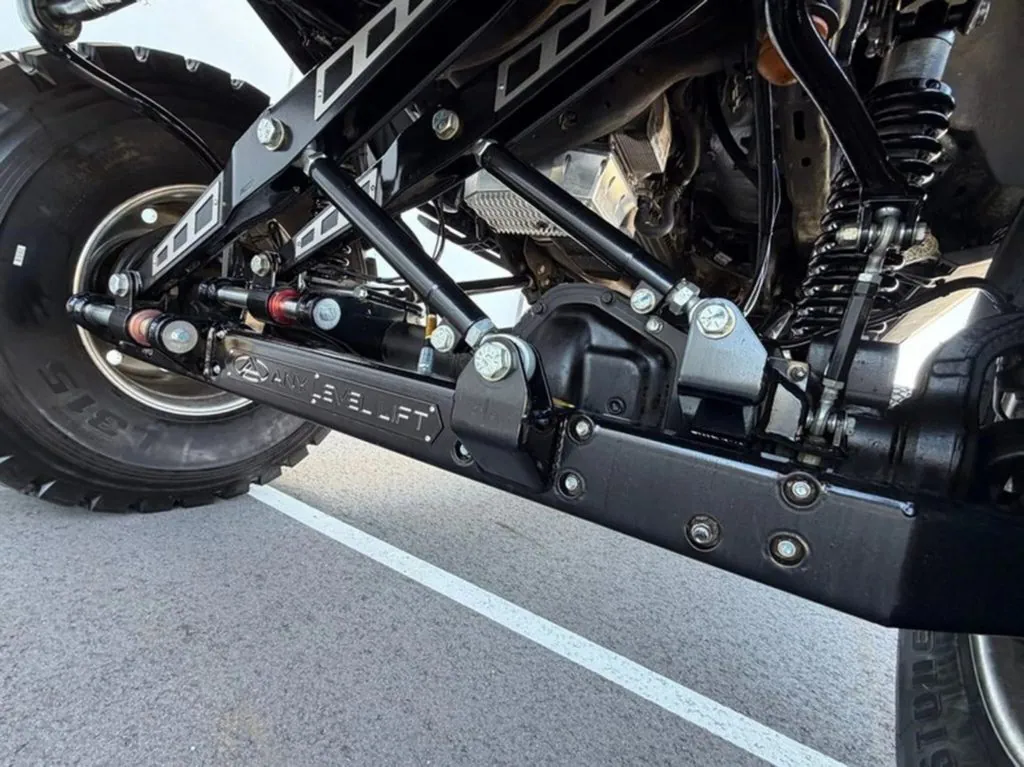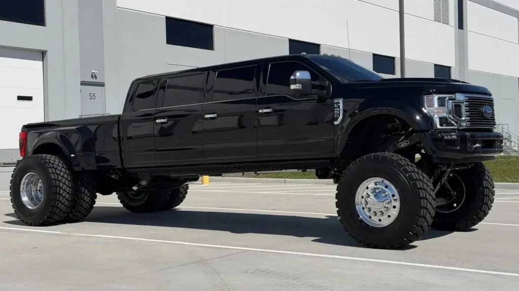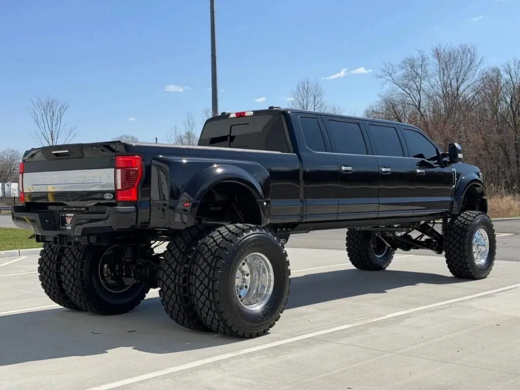 Beyond its heavily stretched ladder-frame chassis and extended bodywork, the build retains Ford’s 6.7-liter Power Stroke V8 diesel engine, now upgraded with a new intercooler, enhanced forced induction components, and a revised engine control unit. A specially engineered suspension system allows independent ride-height adjustment for each axle. In its highest setting, the massive pickup limo can roll on 46-inch tires paired with dual rear wheels.
