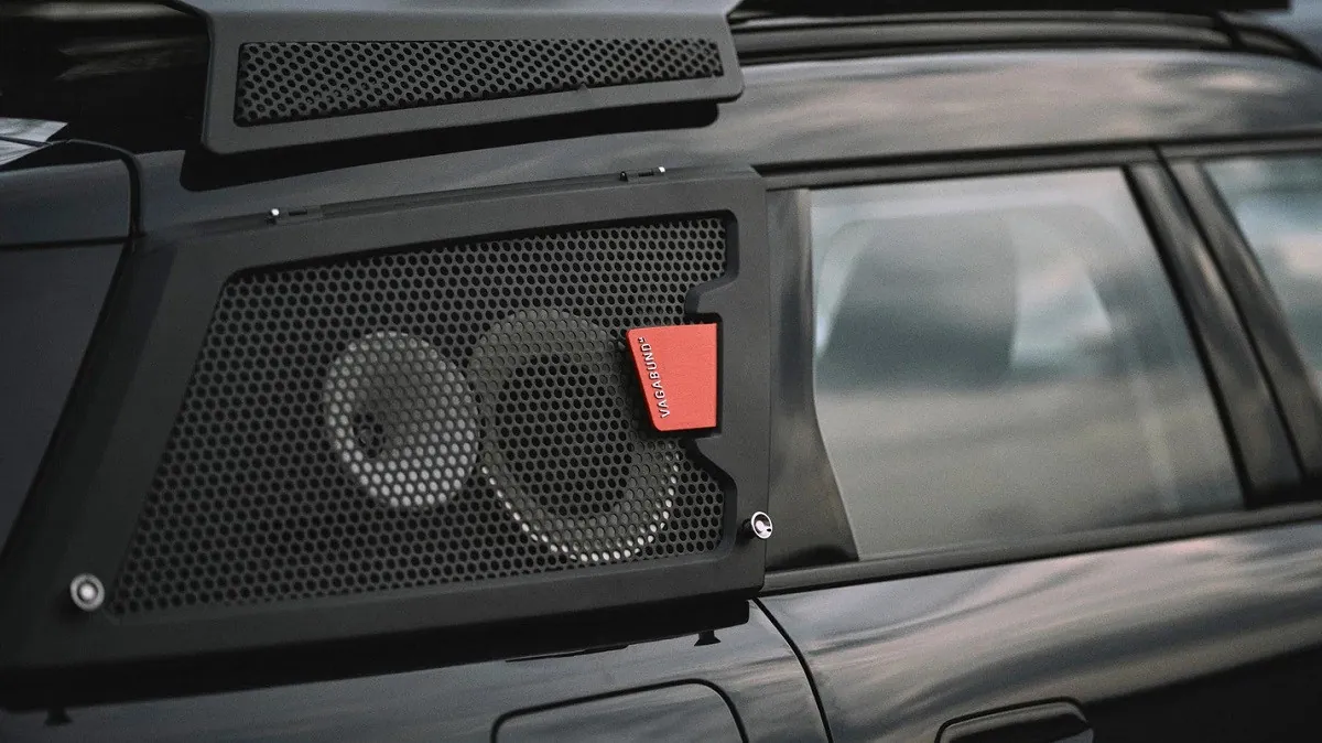 The exterior redesign goes far beyond paint. The vehicles feature custom grilles with Vagabund branding, redesigned bumpers, flared fenders, and 20-inch wheels fitted with 3D-printed covers inspired by speaker hardware. Additional studio branding appears on the side sills, along with unique graphics on the front doors beneath the mirrors.