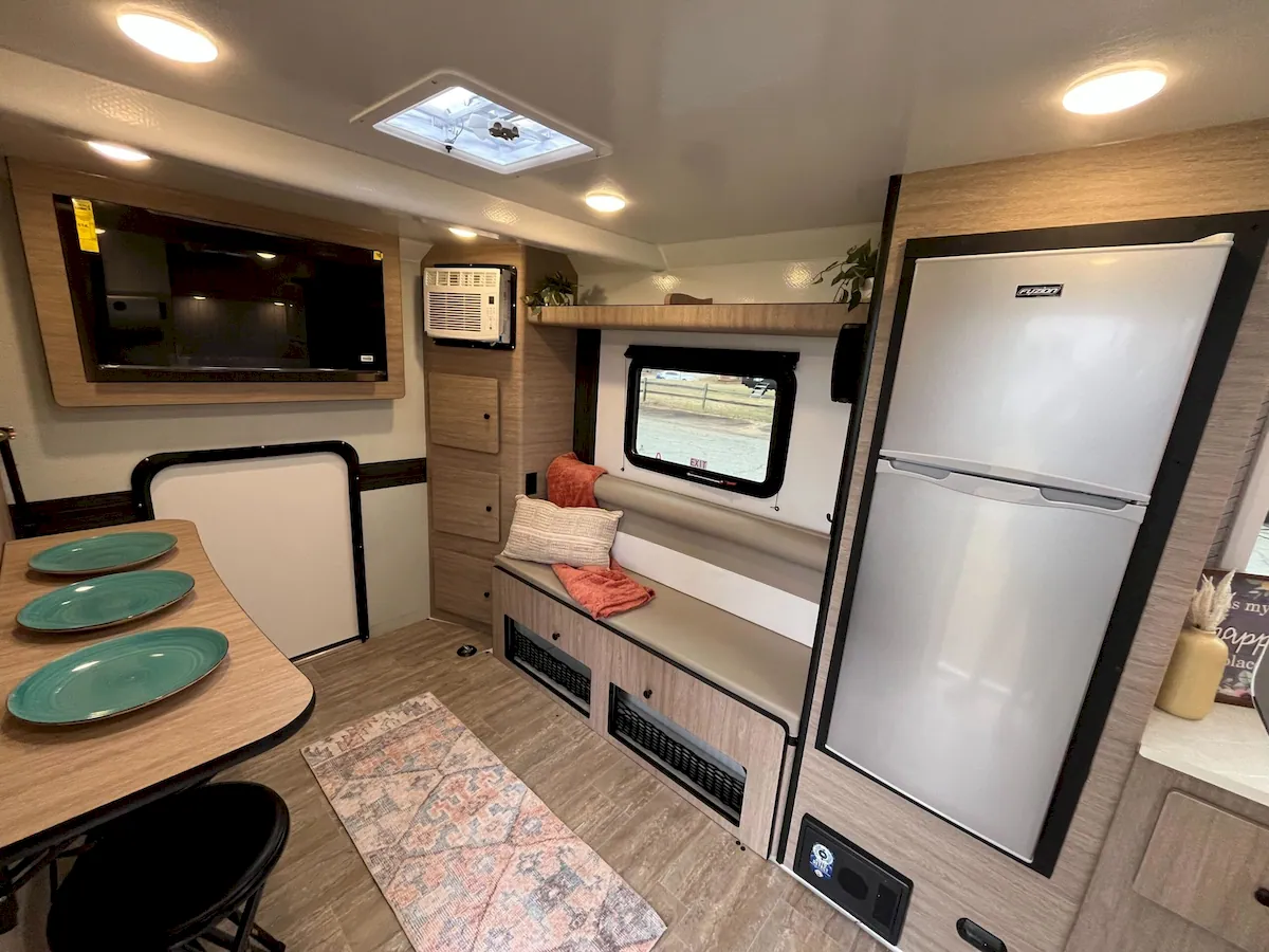 The interior layout is unlike anything else in this class. The 13LEAF also comes loaded with features you normally wouldn’t expect in a trailer this size, including a dry bath, a rear cargo-style door for bikes, a separate dining area, and a surprisingly complete kitchen setup.