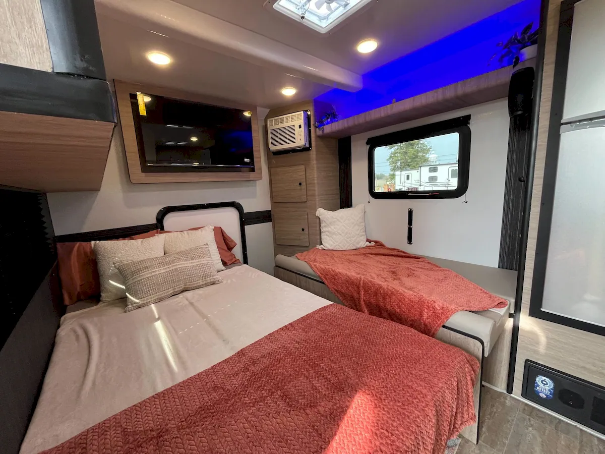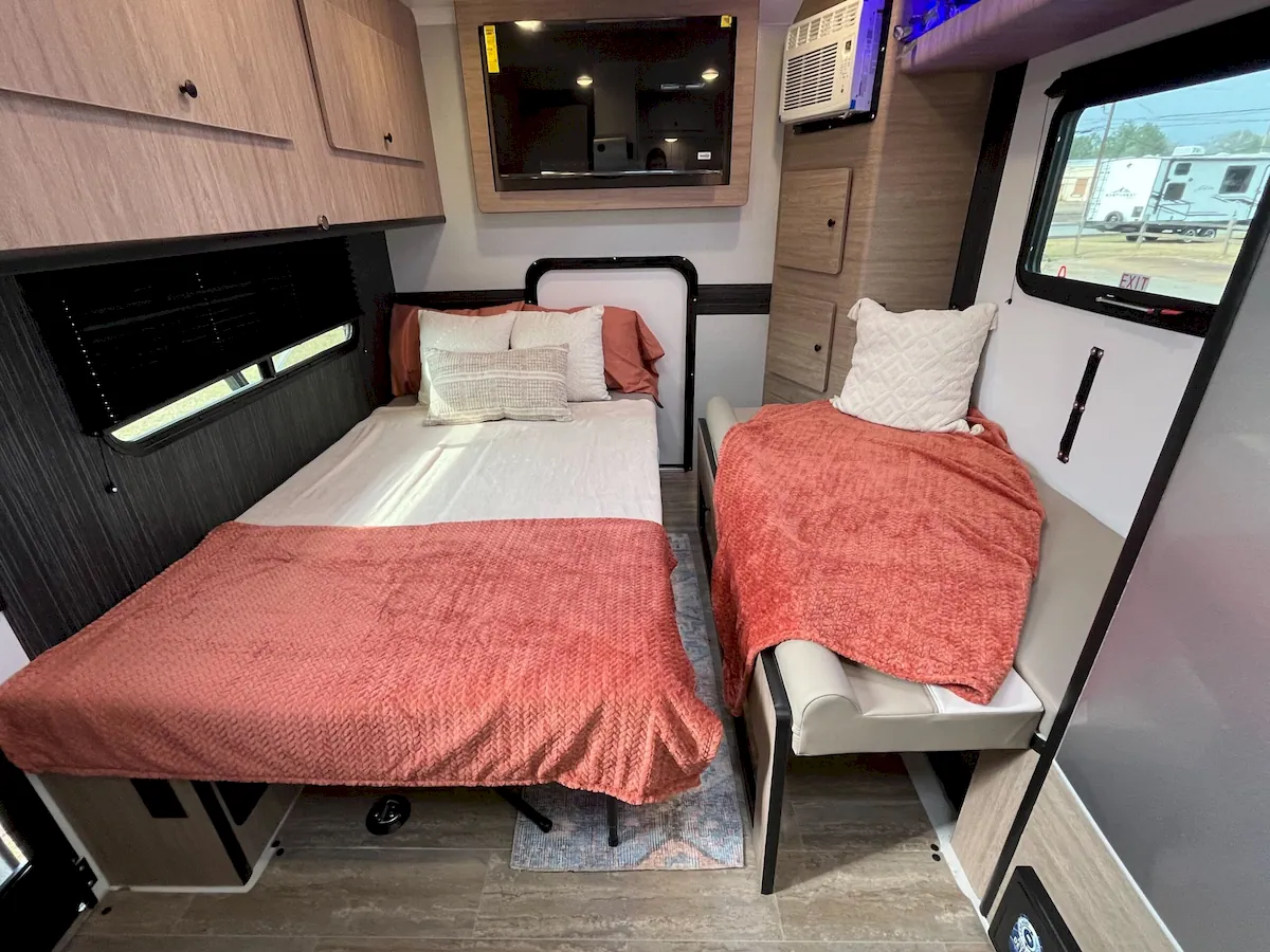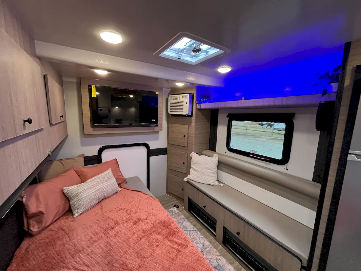 Storage is spread throughout the cabin, including built-in cabinets with multiple doors and overhead compartments on the campsite side. LIV claims the 13LEAF offers “tons of storage,” which feels fair considering the tight footprint.