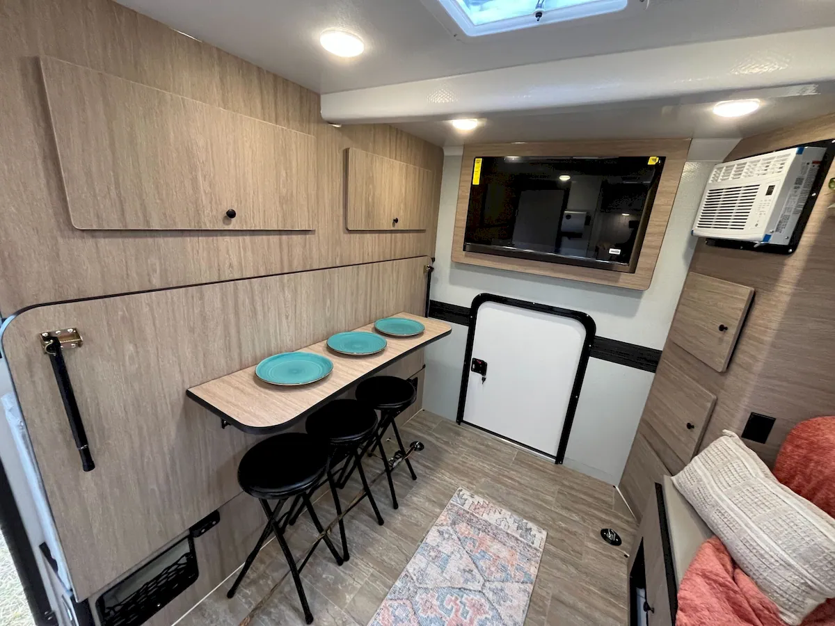 At the rear, the space functions as a lounge during the day and a sleeping area at night. There’s a gaucho-style sofa on the driver’s side and a bar-height dining setup with three stools on the opposite side, leaving a clear aisle through the center.