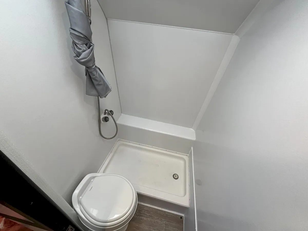 The bathroom is a compact setup that sits somewhere between a dry and wet design. Instead of combining everything into one wet room like some manufacturers do, LIV separates the toilet and a small curtained shower. There’s no sink inside, but the separation of toilet and shower still makes it more usable than some ultra-compact layouts.