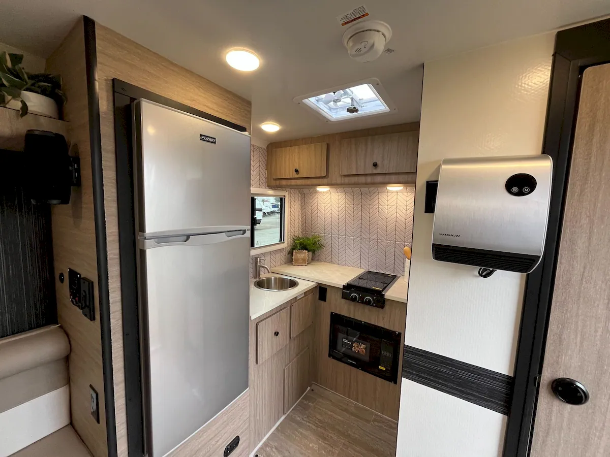 Up front, the kitchen sits at the nose of the trailer, with the bathroom immediately to the right when you step inside. Standard kitchen equipment includes a large fridge with freezer, a two-burner gas cooktop, microwave, stainless-steel round sink, plus a decent amount of counter space and storage. It’s not exactly a chef’s kitchen, but for a trailer this size, it covers the basics well.