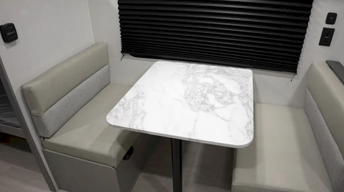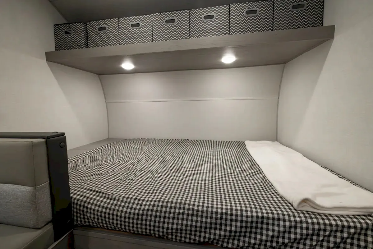 Storage is fairly solid for a trailer this size. Inside, you’ll find overhead compartments at the front, storage under and around the main bed, space beneath the dinette seats, and a small cabinet above the kitchen.