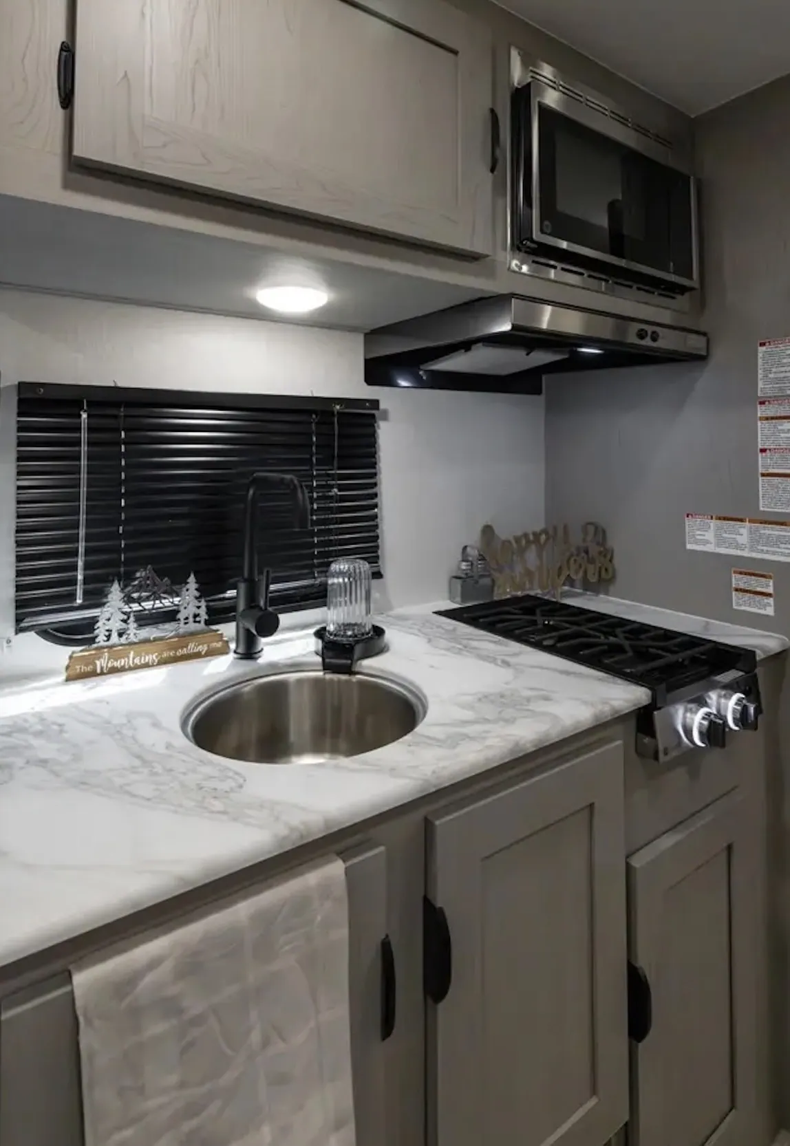 Kitchen space is another area where things get tight. Counter space is limited, even though the stovetop cover sits flush with the counter. Meal prep can take a little planning, especially if you’re cooking and chopping at the same time. The dinette table can double as extra prep space if needed.