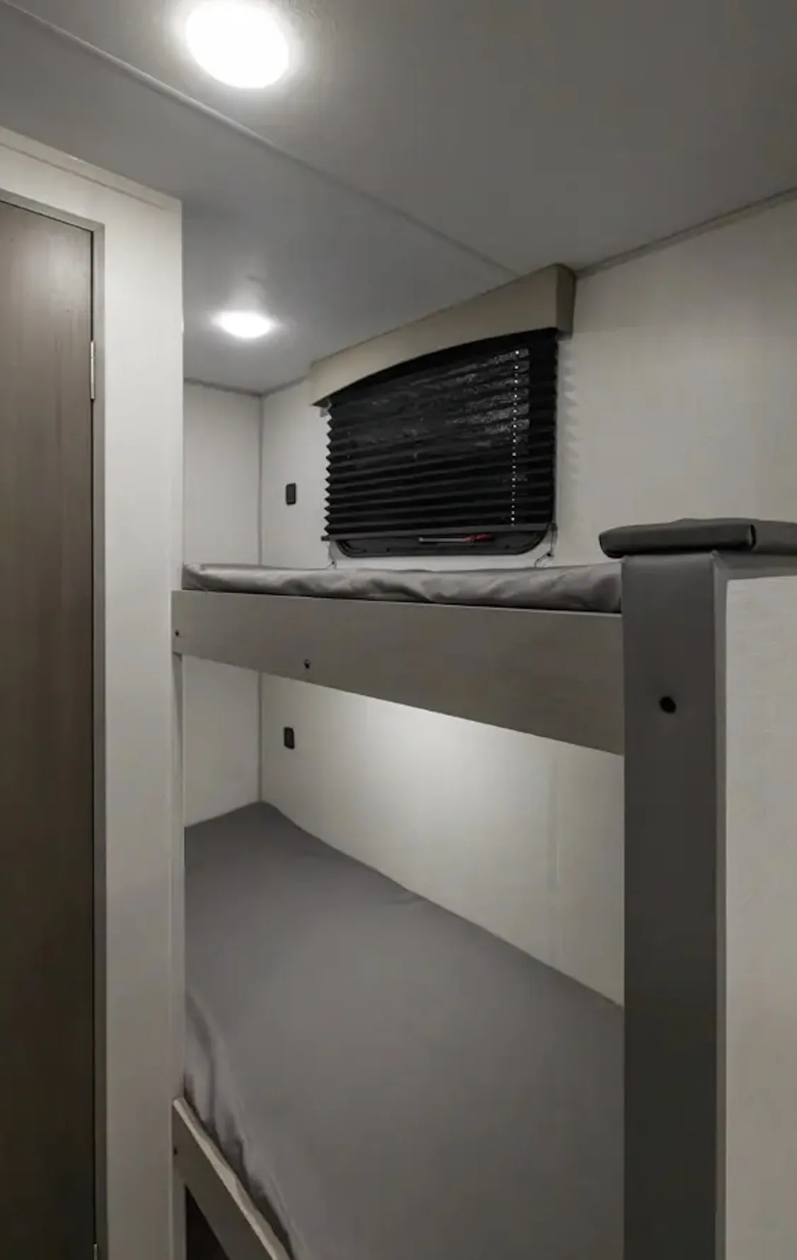 Step inside, and the interior feels pretty basic in terms of styling. That said, it still manages to include all the essentials: a full kitchen, dinette, sleeping area, bunk beds, and a dry bathroom.