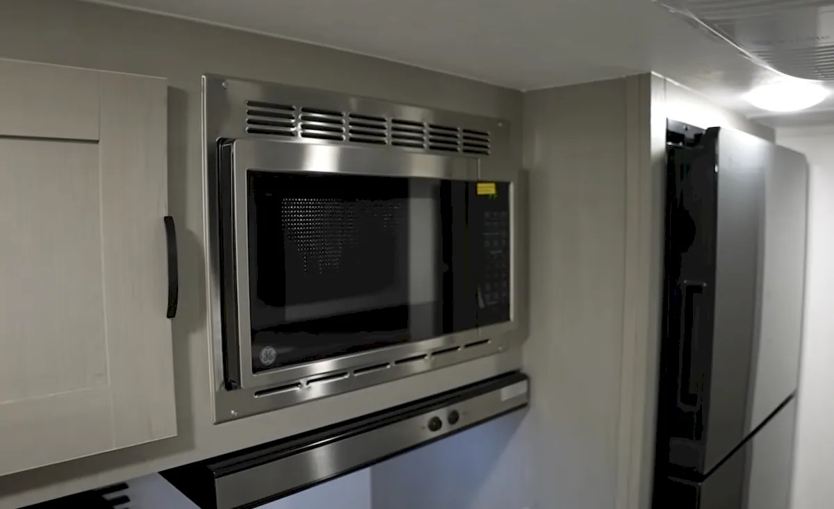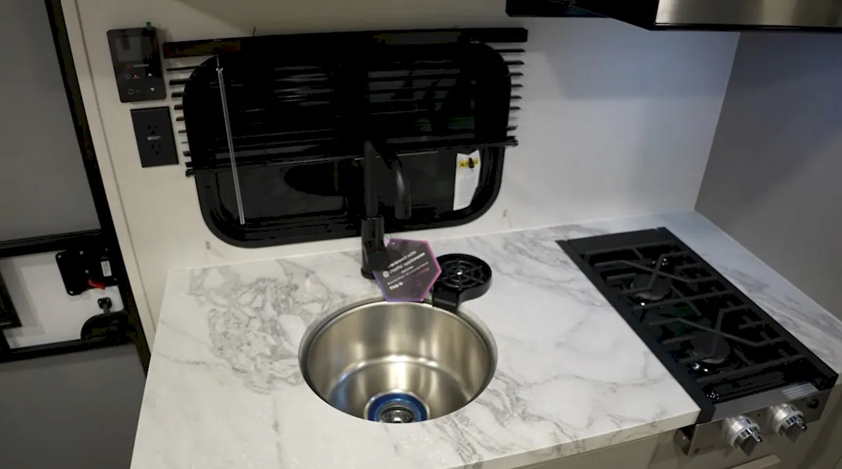 Coachmen also packed in more features than you might expect at this level. The trailer includes a tankless water heater, a 20,000 BTU furnace, GE Appliances equipment, roof-mounted A/C, a range hood, USB ports, and more.