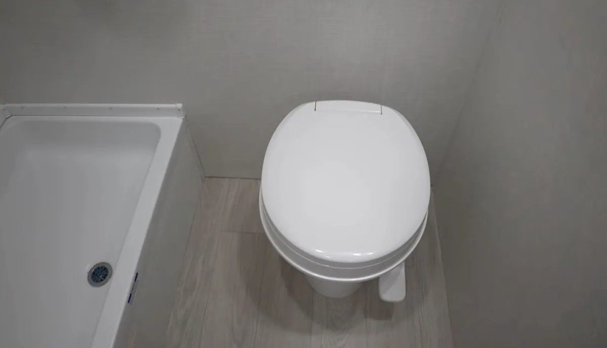 The bathroom isn’t fully equipped, though—it’s missing a sink. That means you’ll be using the kitchen faucet or shower for washing hands or brushing your teeth, which might not be ideal for everyone.