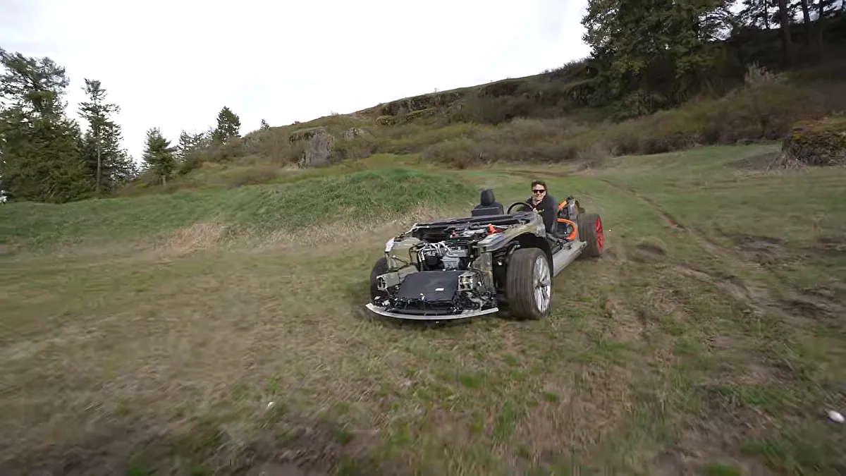 Evans ended up purchasing the vehicle and drove away with little more than the essentials: seats, steering wheel, electric motors, battery pack, and central display. Missing were major components like the windshield, body panels, and even seat belts.