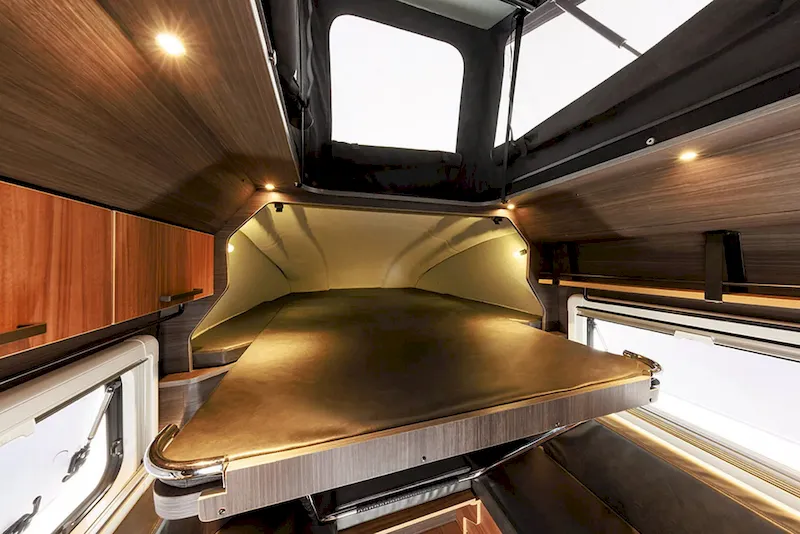 The kitchen area, equipped with a folding table, easily converts into a 2.3-meter (7.5 ft) double bed. Another 1.66-meter (5.4 ft) bunk above the cab offers space for children. Thanks to the camper’s extendable roof section, the ceiling height increases, filling the interior with natural light.