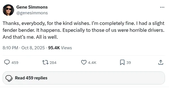 American musician and legendary KISS frontman Gene Simmons was involved in a car accident on October 7 after losing consciousness behind the wheel and crashing into a parked vehicle.