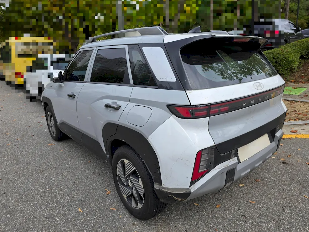 The exterior design has been significantly refreshed. The front now features a large, square grille with horizontal slats, giving the crossover a more confident and even aggressive stance. Vertical LED headlights with slim DRLs, silver bumper accents, rugged plastic cladding, and new 16-inch alloy wheels emphasize its SUV character. At the rear, redesigned taillights, a new bumper, and a more sculpted body profile give the Venue a sportier and more dynamic look.