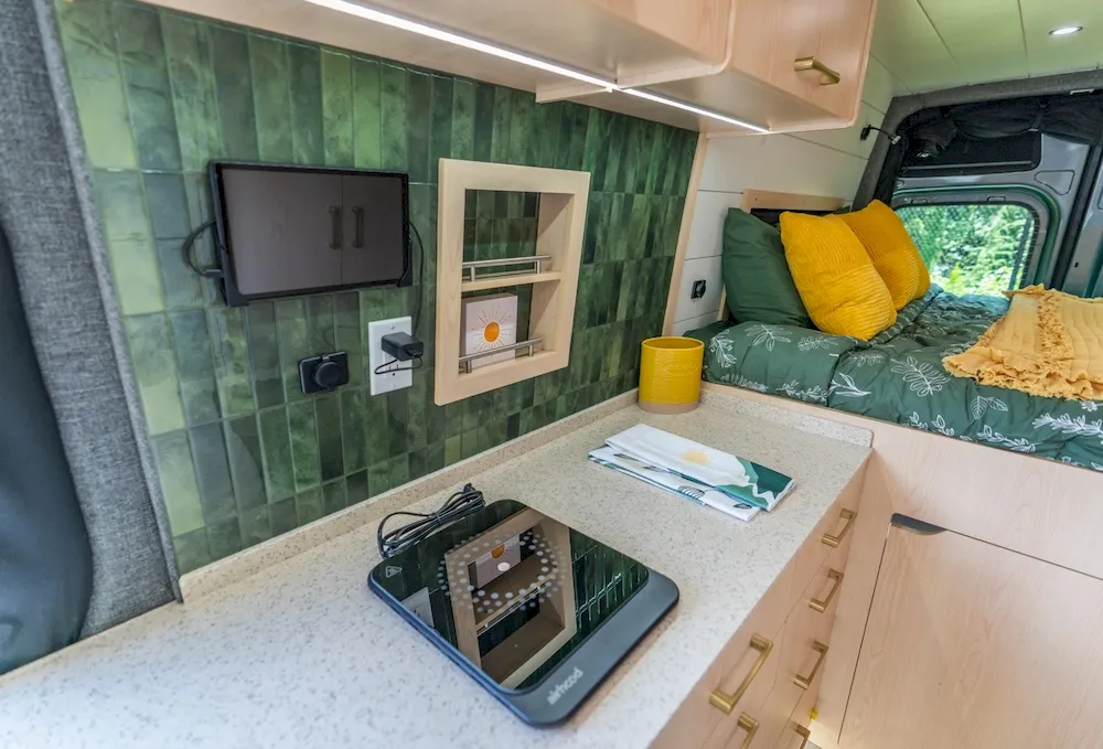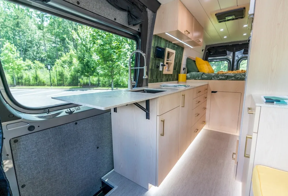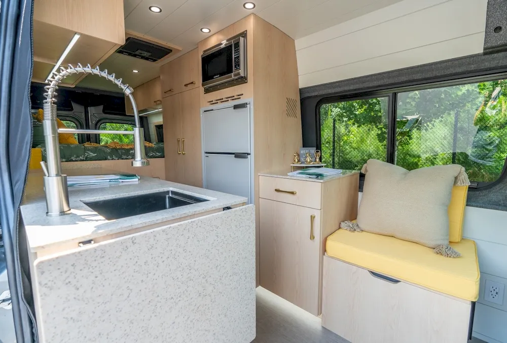 The Vanhalla’s systems are built for independence. A 25-gallon freshwater tank supplies water through an electric pump, supported by a 4.5-gallon Bosch water heater. For comfort in any weather, the van includes a Dometic RTX 2000 12V air conditioner and a MaxxAir Deluxe vent fan.