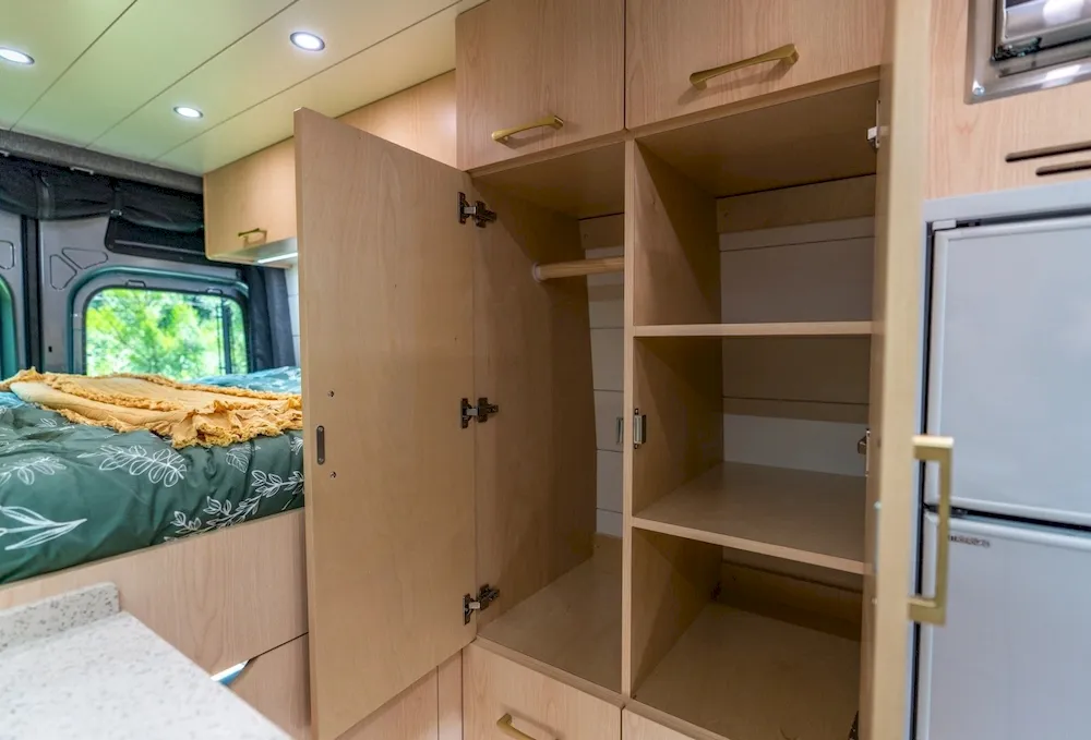 Storage is one of the van’s biggest strengths. Drawers and cabinets in the kitchen keep essentials organized, the bench hides extra compartments, and a full-height closet provides space for clothing and gear. Beneath the bed lies a large garage area perfect for bulky adventure equipment, tools, and the van’s plumbing and electrical systems. An outdoor shower at the rear adds even more convenience for post-adventure cleanup.