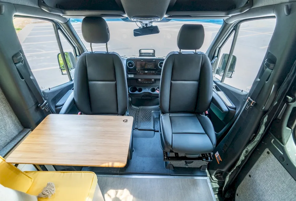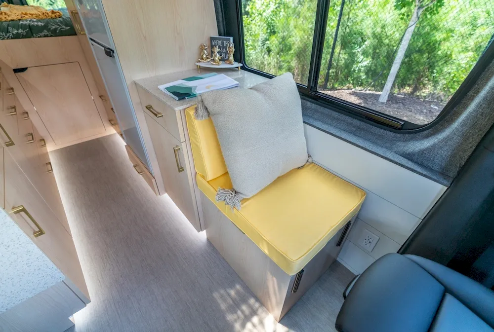 The front section serves as the living area, where both cab seats swivel to face a bench seat and a Lagun-style table with a bamboo top—ideal for dining or working. The bench’s reversible back cushion allows it to face either the galley or the window, providing flexibility. A slider window offers fresh air and scenic views, while an overhead shelf with a zippered cover keeps essentials neatly tucked away.
