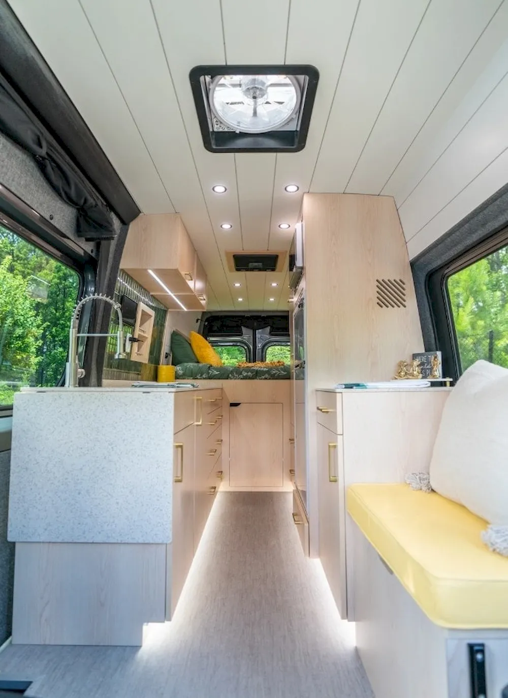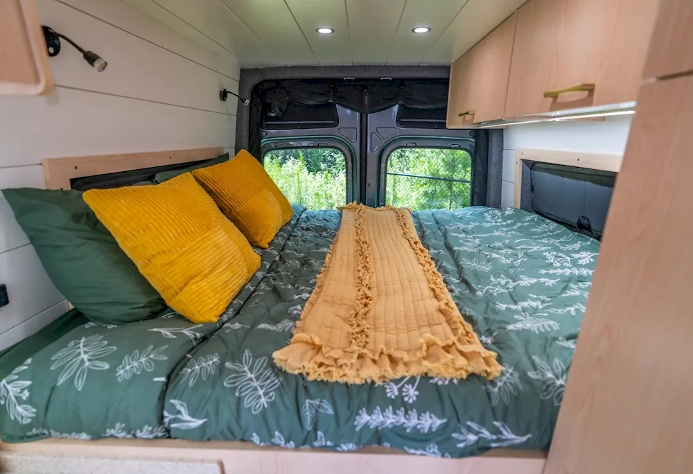 At the rear, the bedroom area features a queen-size platform bed with a five-inch mattress and upper cabinets for storage. The calming green and yellow hues create a restful atmosphere, while dual slider windows bring in fresh air and natural light. Small details, such as reading lights and Van Essential storage bags on the rear doors, make the space both cozy and practical.