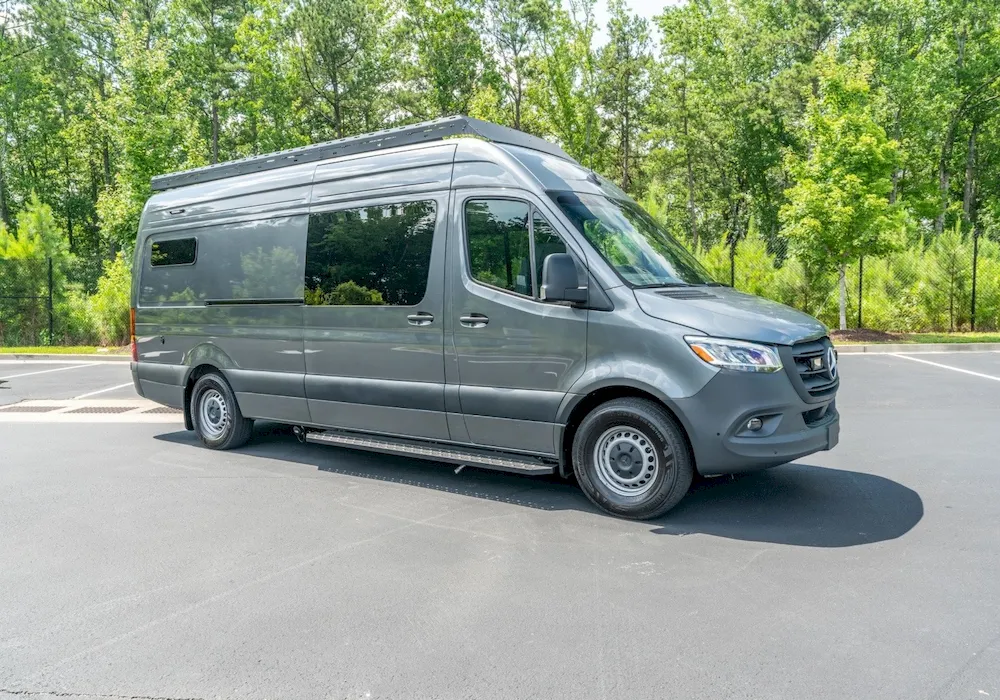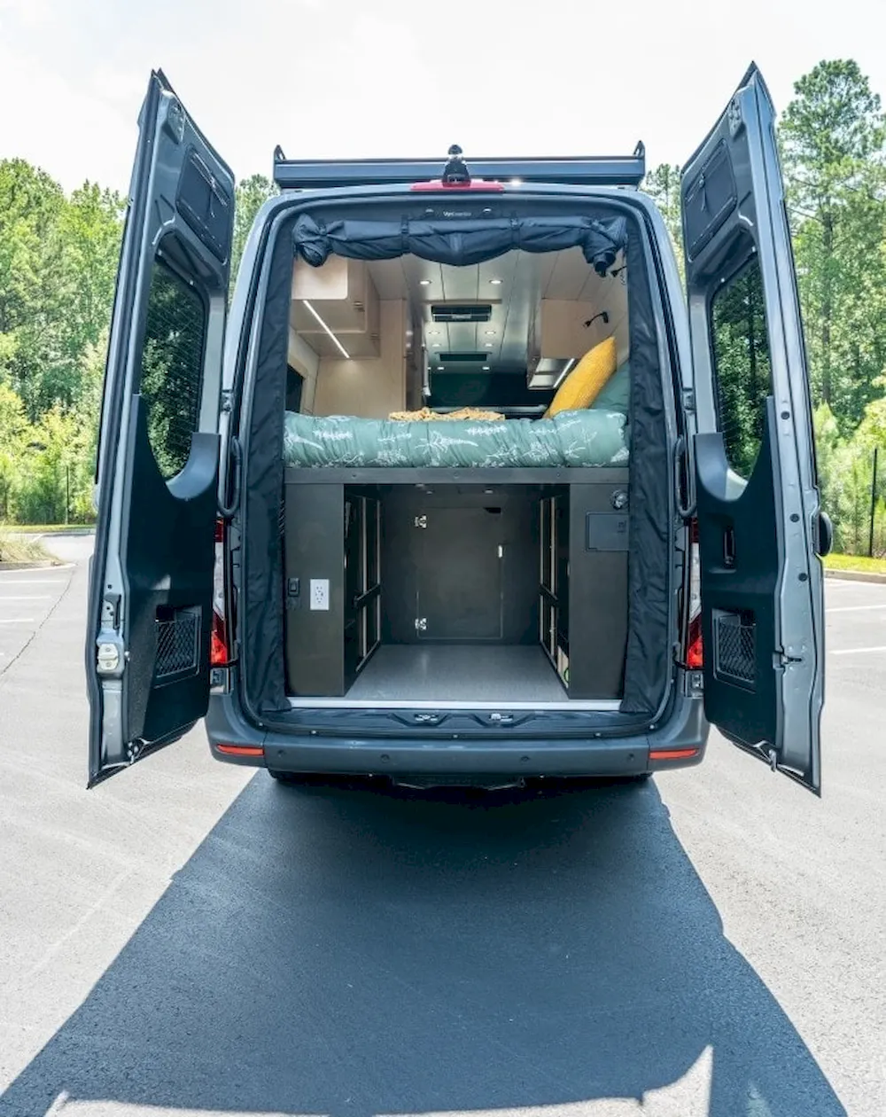 The Vanhalla is based on the firm’s Sequoia layout, transforming a 170-inch-wheelbase Sprinter into a self-sufficient mobile home. Its exterior is understated—finished in a subtle gray—but it conceals several smart upgrades meant to elevate the camping experience. At the front, Triple-R grill lights improve visibility, while Aries RidgeStep side steps make climbing in and out easier. On the roof, a Flatline Van Co. rack supports gear and solar panels, complemented by porch lights that brighten the campsite after dark.