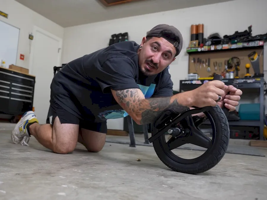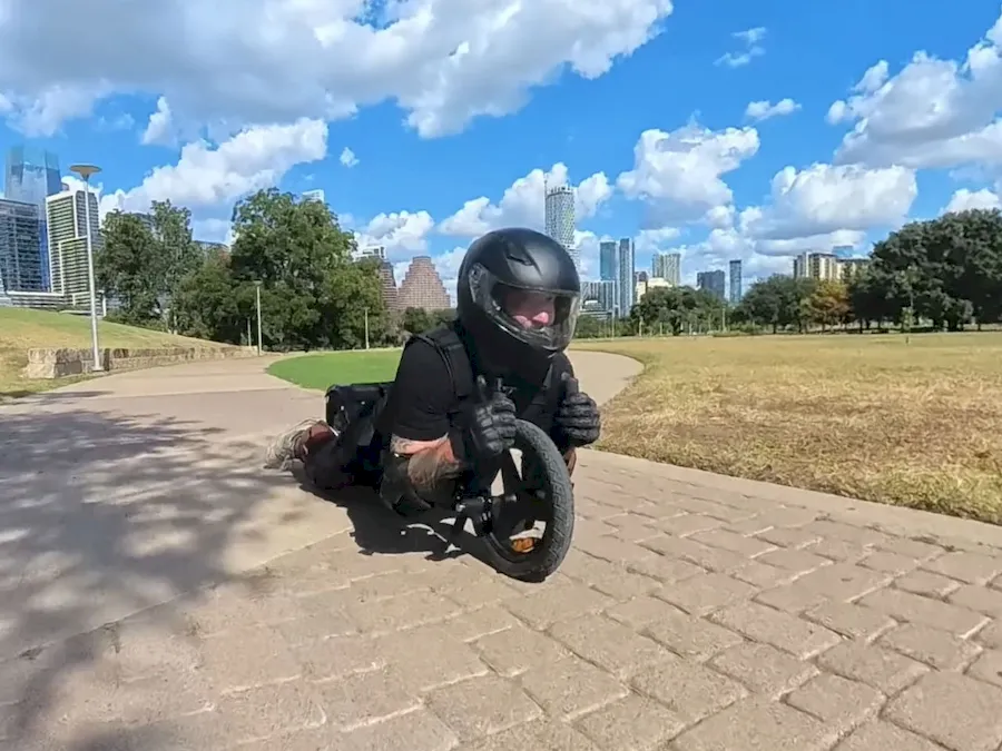 Inventor and YouTuber Jake Carlini has transformed a wrecked electric bike into something truly unconventional — a wearable motorcycle suit that allows him to ride while lying almost flat, in a planking position. After his original bike was destroyed in a crash, Carlini salvaged key components — the rear-hub motor and battery — and decided to reimagine the concept entirely. Instead of rebuilding the traditional frame, he attached the motor directly to his lower legs using painter’s stilt straps, essentially turning his legs into the drivetrain itself.