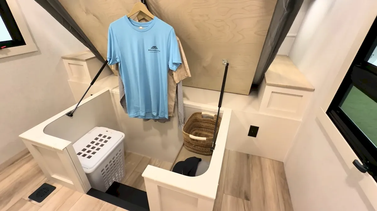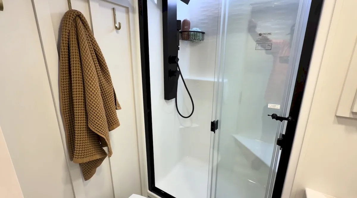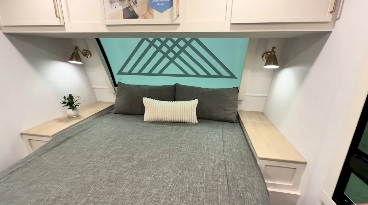 Up front, the bathroom and bedroom make smart use of space. The bathroom features a fiberglass shower with a rainfall tower, an elegant vanity, a porcelain foot-flush toilet, and a linen closet that connects directly to the bedroom — perfect for laundry storage.