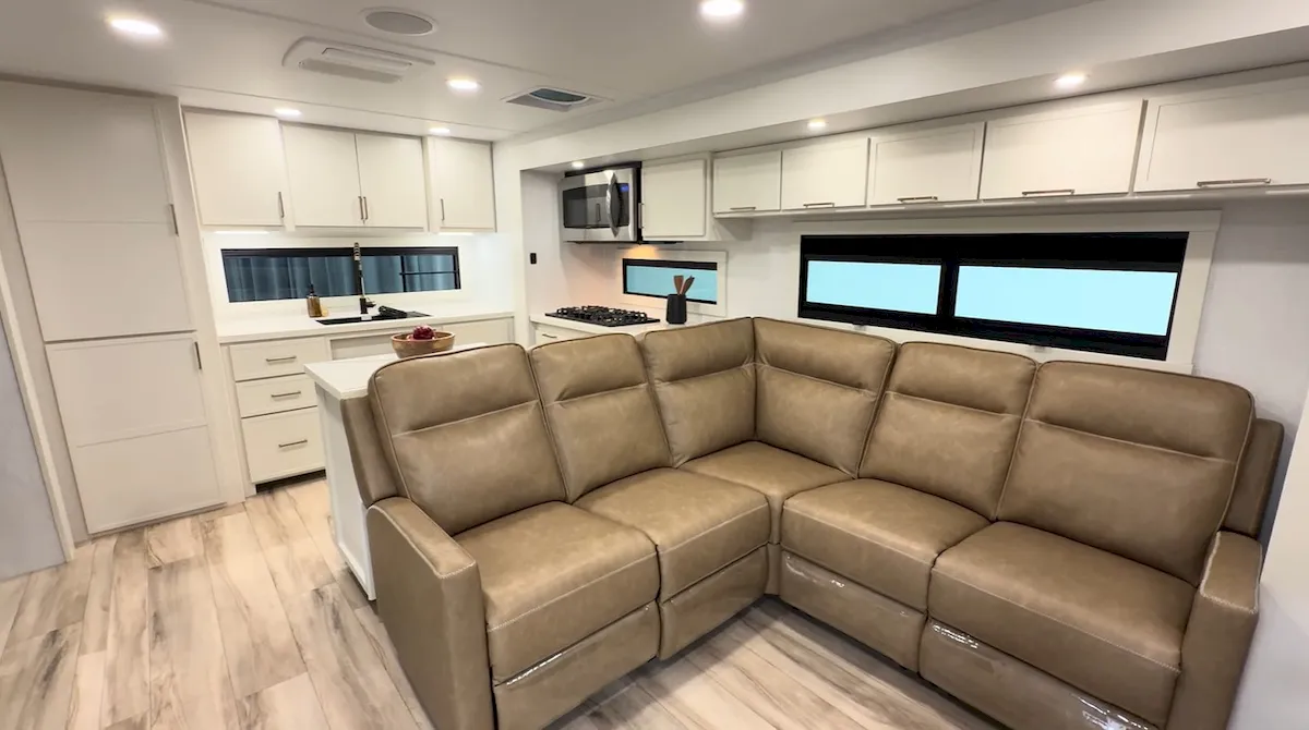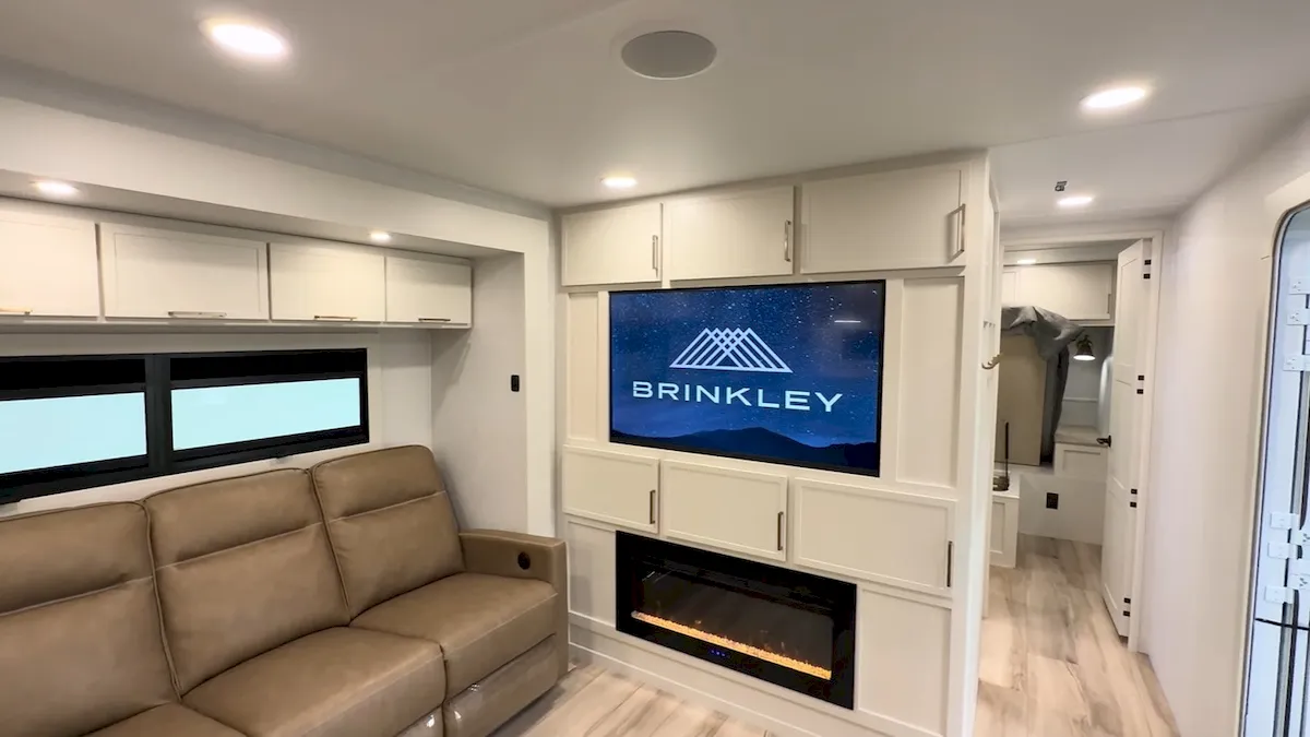 Entry is directly into the living area, which showcases Brinkley’s signature mix of style and practicality. There’s a full entertainment wall with a smart TV and a panoramic fireplace, plus an L-shaped seating area that combines reclining theater chairs with a pull-out sofa.