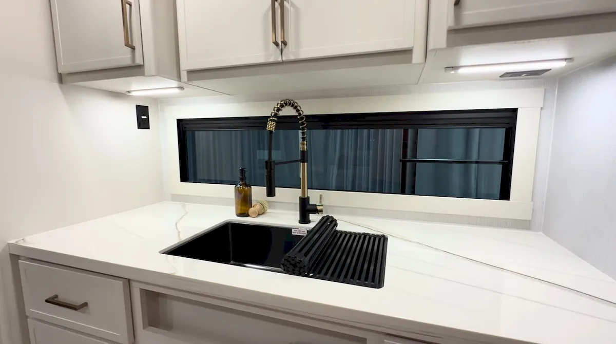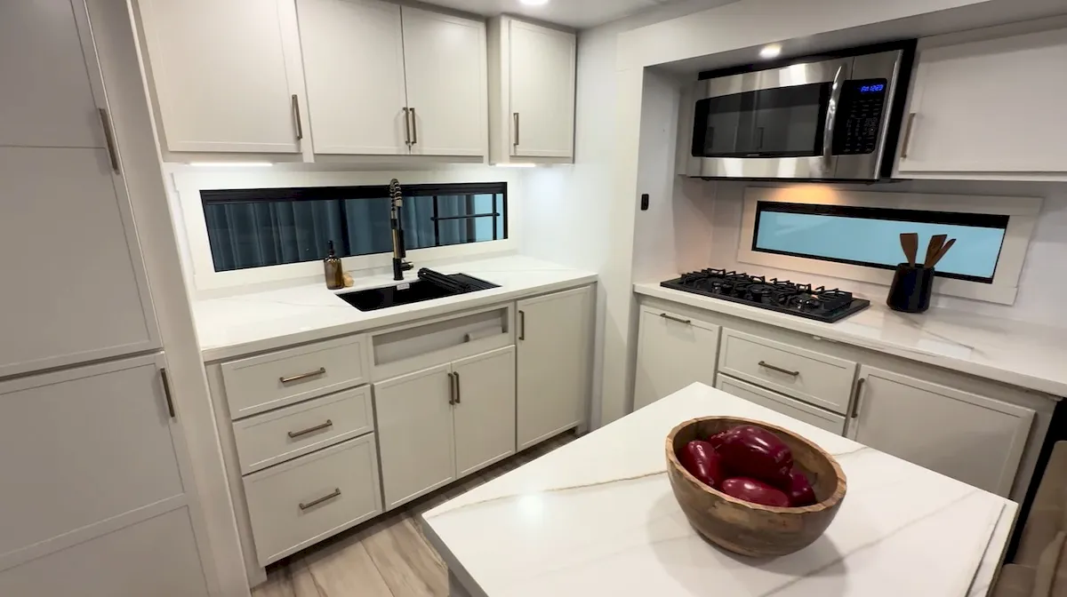 The kitchen occupies the rear of the trailer and feels decidedly residential, with high-end appliances, abundant storage, and a modern aesthetic. A center island with a flip-up extension adds extra prep space. Standard features include a 12V Furrion double-door fridge with freezer drawer, a 3-burner gas cooktop, and a microwave. There’s also an option for a built-in dishwasher if you’re willing to trade a bit of storage. True to Brinkley form, you’ll find thoughtful touches like a dedicated trash drawer, paper towel holder, solid-surface counters, dovetail drawers, and soft-close hinges.