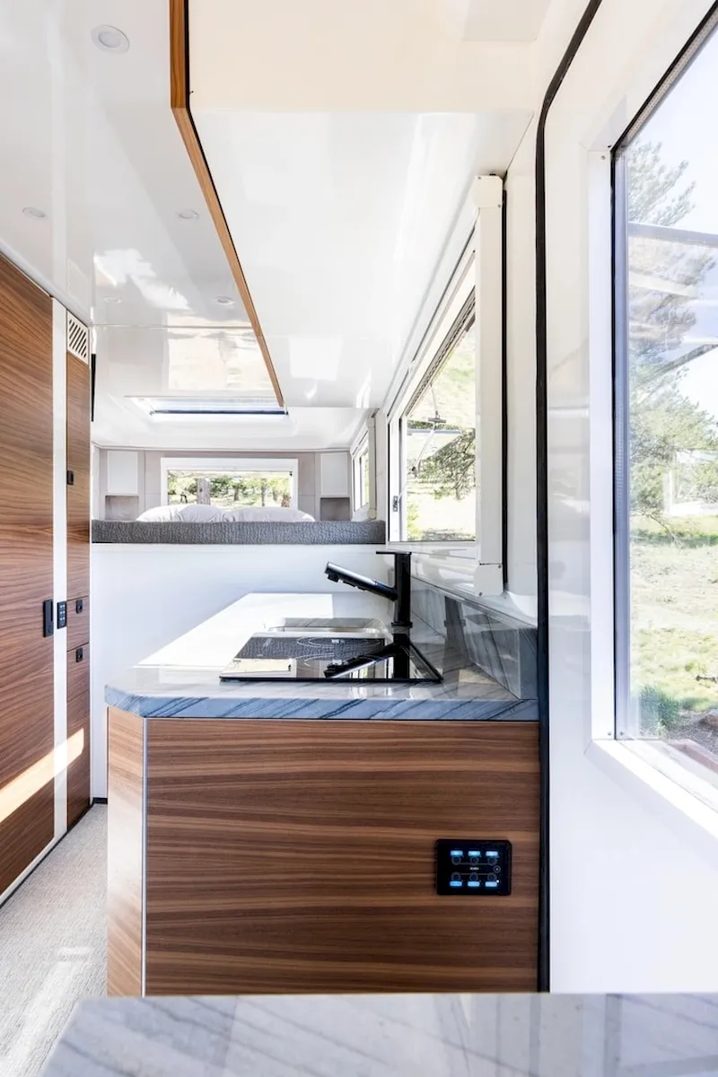 The kitchen is designed for practical everyday use, featuring Blum soft-close aluminum cabinetry and your choice of granite or PaperStone countertops. It’s equipped with a sink, a two-burner induction cooktop, a 200-liter fridge-freezer, and a six-in-one microwave, making it easy to cook full meals on the go.