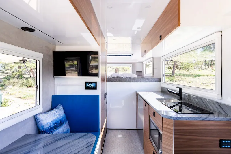 The interior height of 7 feet 2 inches adds to the open, airy feeling. The floor plan is smartly designed with an over-cab sleeping area, a kitchenette along one wall, a full bathroom opposite it, and a booth-style lounge and dining area at the front.