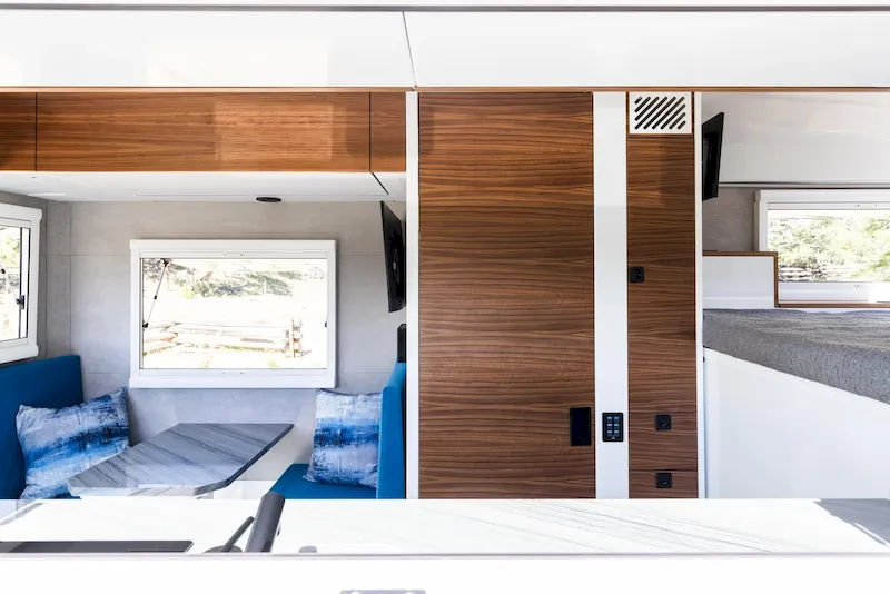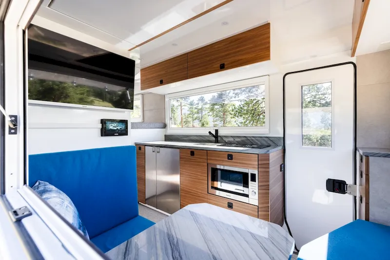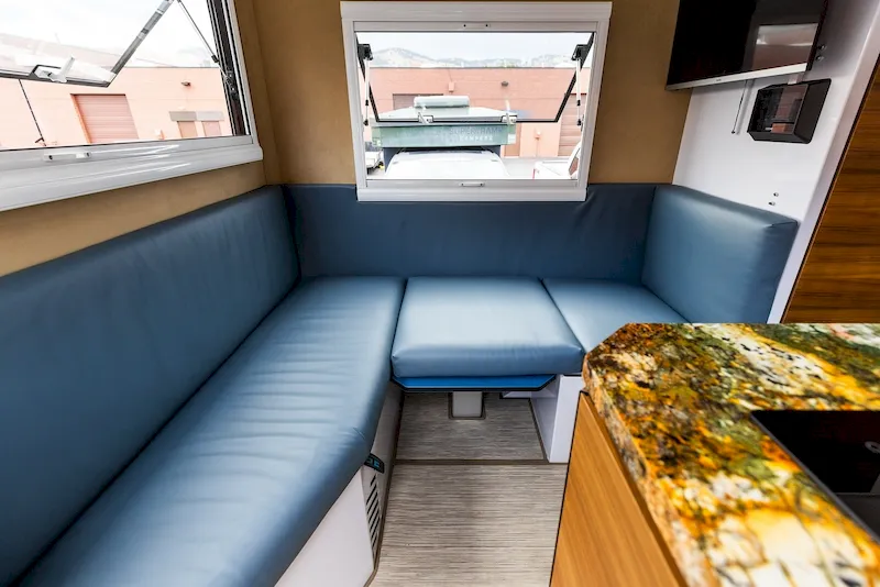 At the rear, a cozy booth-style dining area doubles as a relaxing lounge. It comfortably seats four people and includes an actuator-powered fold-down table that can convert into an additional six-foot sleeping area. Overhead, there’s “airliner-style storage,” where cabinets drop down for easy access and then retract neatly back into place — a clever solution to make use of the camper’s height. The benches below the seats also offer hidden storage, even long enough for full-length skis.