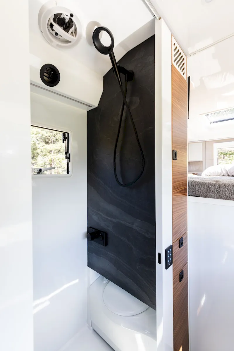 Across from the kitchen is the bathroom — one of the most impressive you’ll find in any truck camper. With a seven-foot ceiling, it offers enough room to move comfortably. The space combines a shower and a toilet, with the toilet cleverly sliding out of its compartment when needed.
