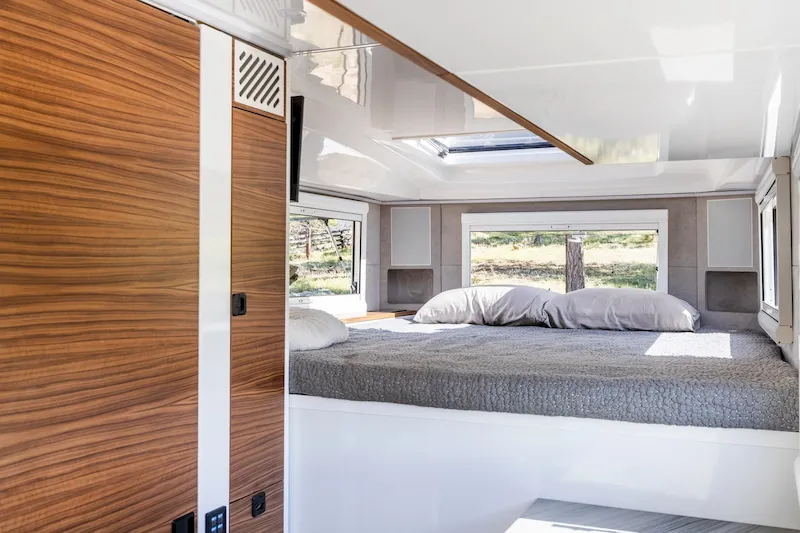 Step inside, and you’ll immediately notice how spacious and bright it feels. Large Outbound double-pane glass windows flood the interior with natural light and provide stunning panoramic views. These windows can be opened for ventilation or sealed for insulation and privacy, complete with integrated bug screens and blackout shades. Whether you’re parked in the desert, forest, or by the ocean, the 360-degree visibility ensures you’re always connected to your surroundings.