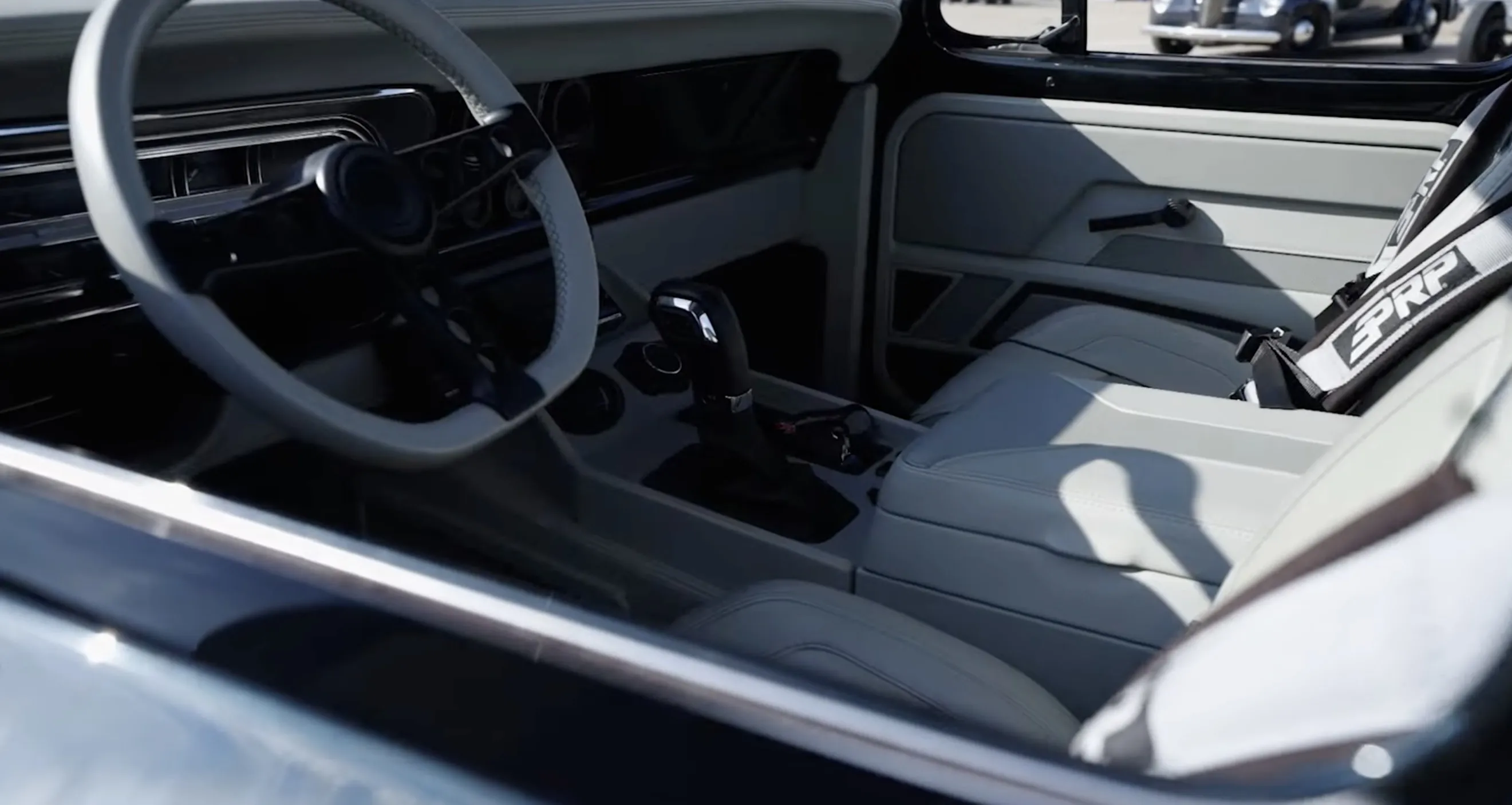 Inside, the upgrades continue. Reupholstered Mustang bucket seats were dropped two inches and reshaped to improve visibility out the back window. Three-point harnesses add both comfort and safety, while Dakota Digital RTX gauges bring in a subtle modern flair. The entire interior is wrapped in custom leather, combining a handcrafted feel with modern refinement.