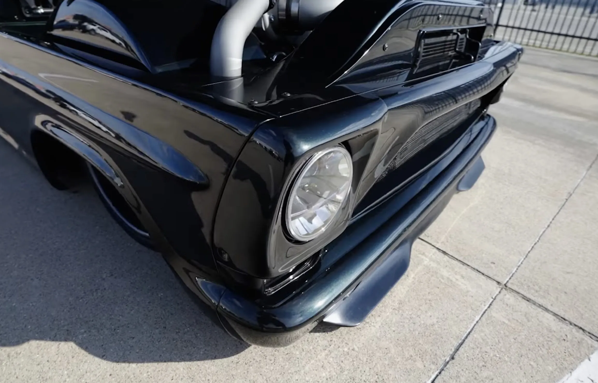 The exterior wears a custom Foster Green paint job that changes tone from black to deep green depending on the light, giving the truck a shape-shifting presence. Details like black ceramic-coated handles, hidden bed strips, and custom hood scoops — built from two separate hoods — show just how far the team went for perfection.
