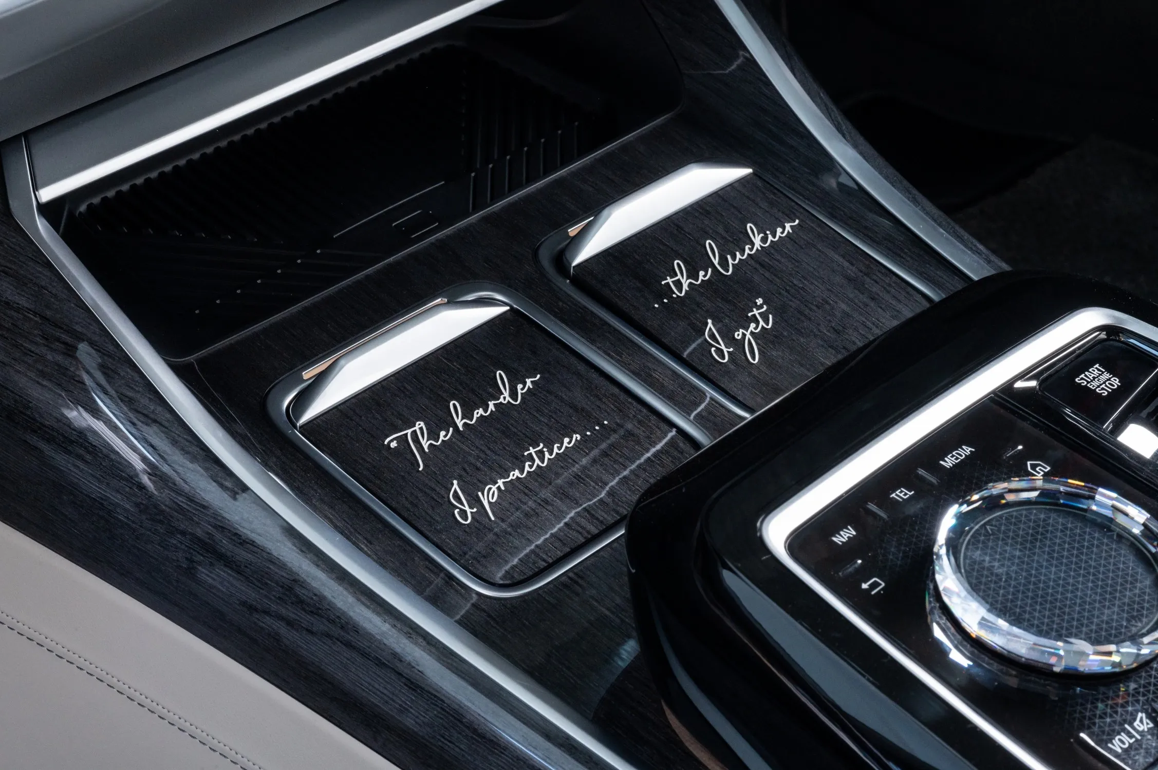 This exclusive M760e xDrive features a distinctive two-tone exterior in Black Sapphire and Dravit Grey, custom badging, and a personalized interior trimmed in contrasting leather with detailed embroidery and Player’s own signature. The door sills bear his famous motto: “The harder I practice, the luckier I get.”
