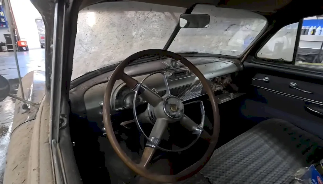 The car is a torpedo-back two-door coupe that had been left untouched for roughly two decades. Layers of dust and grime had dulled the paint, and the chrome trim had lost its former brightness. As is often the case with vehicles stored in rural outbuildings, the Olds had become a temporary home for rodents; nests and droppings were found under the rear seat, in the glove compartment and inside the trunk.