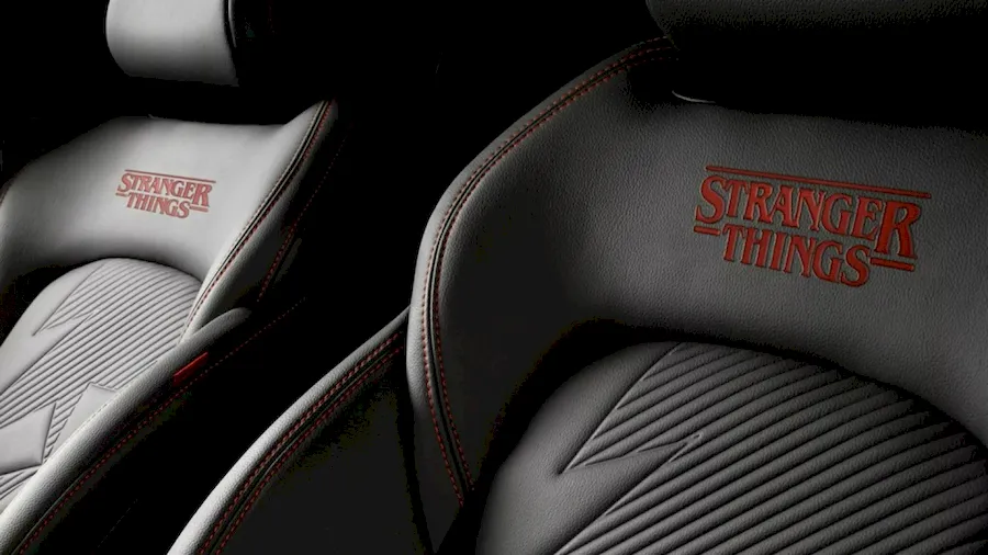 The interior follows the same dark and mysterious theme: black leather sport seats with unique embroidery and the show’s logo on the backrests, an individually numbered plaque on the dashboard, and custom door sill plates. Even under the hood, there’s a playful touch — a decorative engine cover with Stranger Things styling.