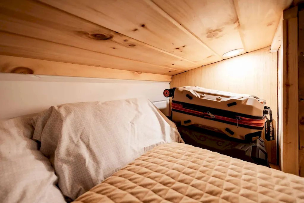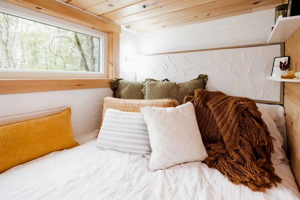 The rear bedroom feels like a snug little nest. With a queen-size bed framed by windows, it’s a peaceful escape. Although not completely enclosed, it maintains privacy with a partial divider and still feels connected to the rest of the home.