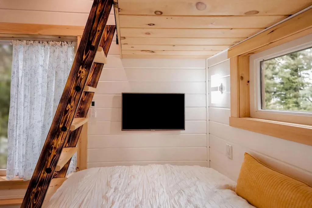 Rustic open shelves let owners add books, framed photos, or décor, while a wall-mounted TV makes it cozy for movie nights. A small removable ladder in front of the bed leads to the 35-square-foot (about 3.25 sq. meter) loft above.