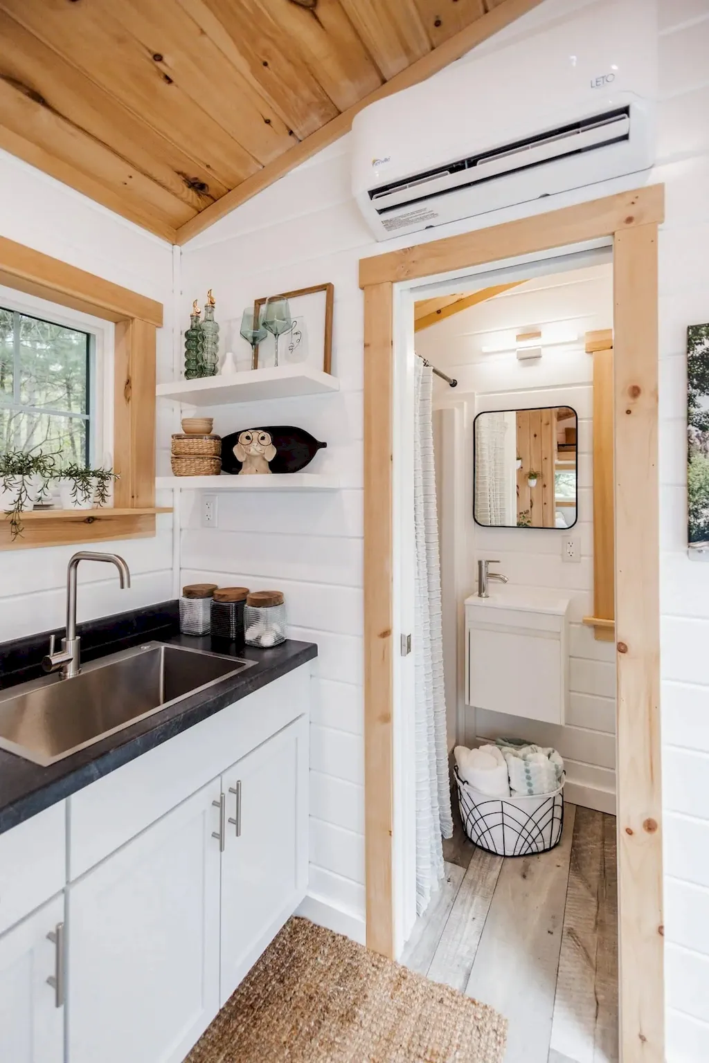 Inside, a glass entry door opens to warm pine walls and white finishes with subtle black details — a balanced blend of rustic coziness and modern calm. Every inch is purposefully used, with zones for lounging, sleeping, cooking, and eating. Details like soft recessed lights, potted greenery, and simple décor make it feel inviting and lived-in.