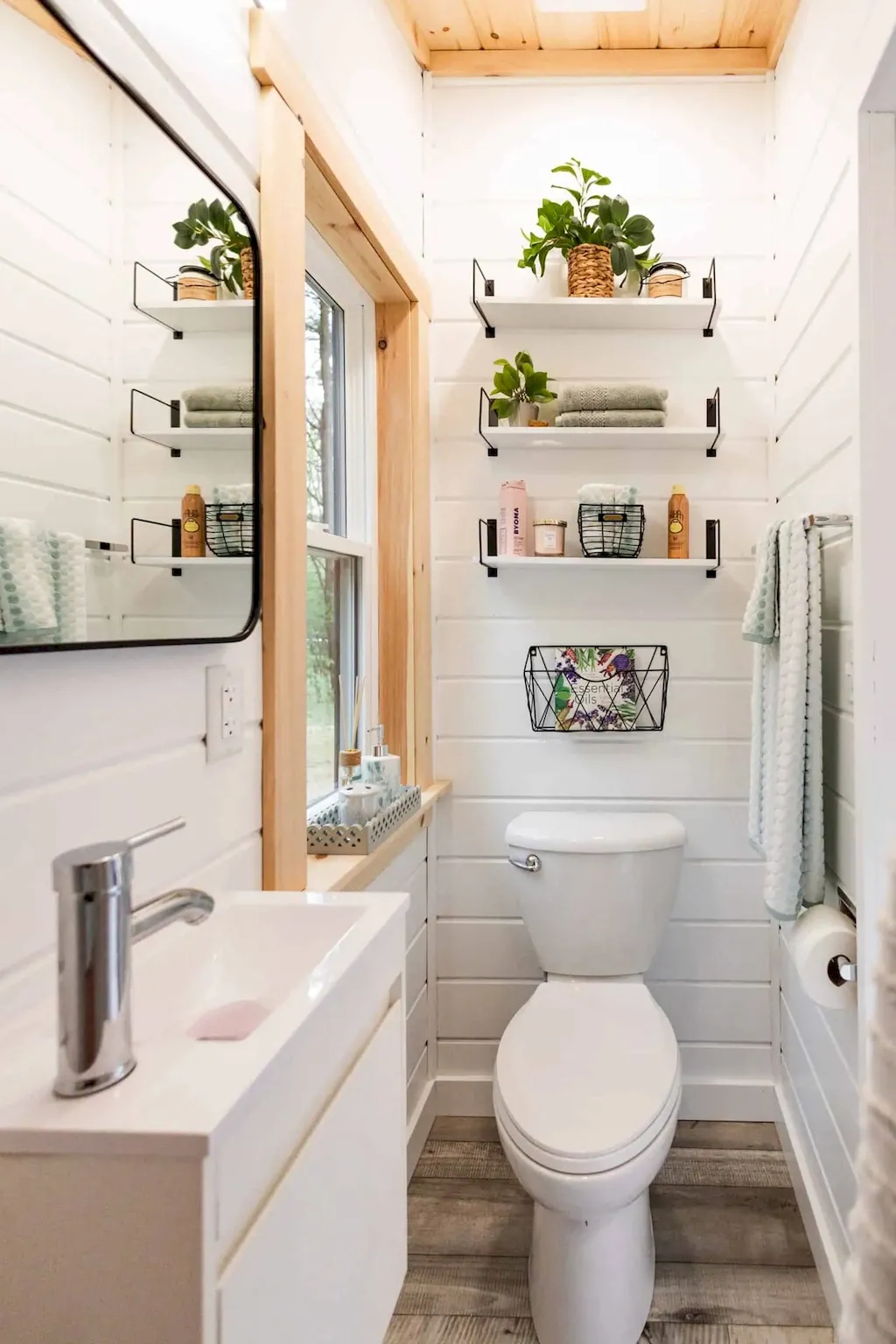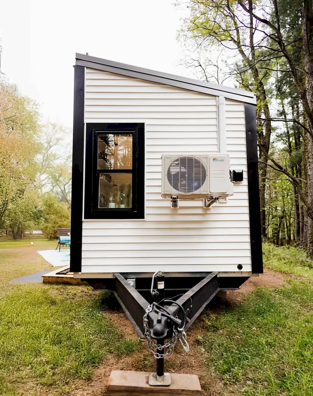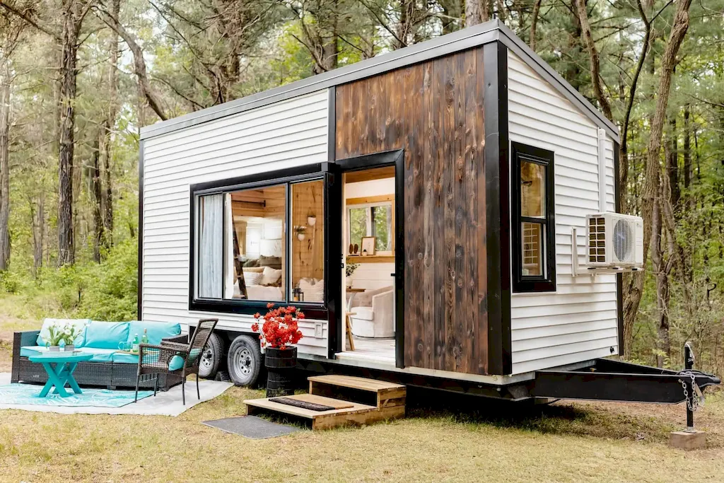 On the exterior, clean modern lines mix with rustic touches — white vinyl siding trimmed in black metal and a charred-wood accent by the door that gives it character. A big three-pane window dominates the front, letting sunlight flood the tasteful interior.